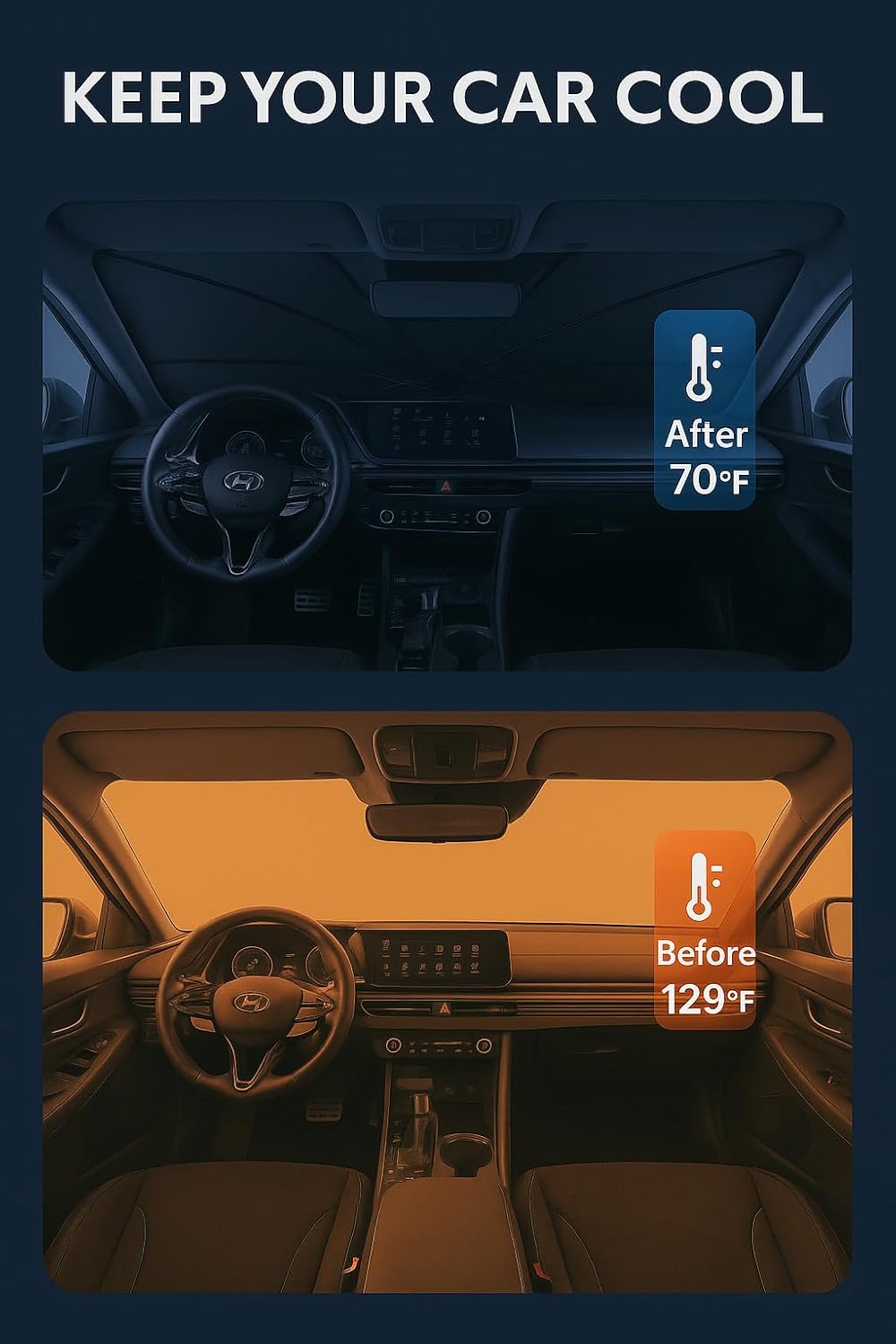 - Certified Sustainable. Customized Windshield Sunshade: Specially designed for the 2021-2025 Hyundai Elantra with precise mirror cutouts, providing 100% shading, carbon fiber handle, ensuring lightweight and durability while also having a fashionable feel. Our Elantra windshield sunshade can protect the interior of your car from various light damage and prevent dashboard and seat degradation.