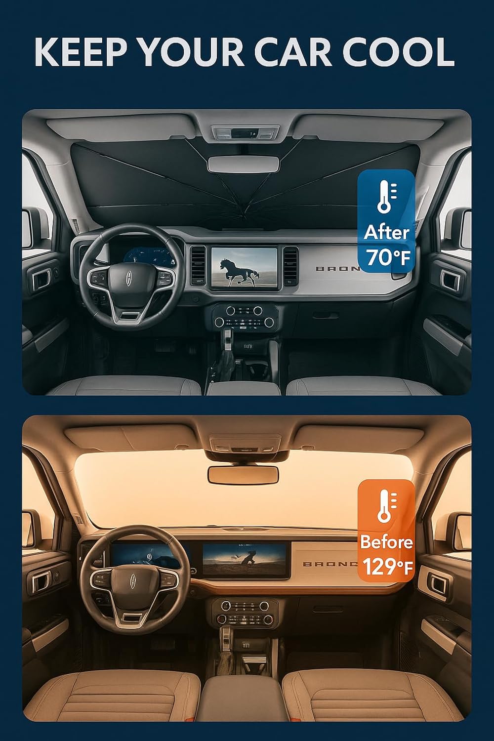 - Certified Sustainable. Customized Windshield Sunshade: Specially designed for the 2021-2025 Ford Bronco with precise mirror cutouts, providing 100% shading, carbon fiber handle, ensuring lightweight and durability while also having a fashionable feel. Our Bronco windshield sunshade can protect the interior of your car from various light damage and prevent dashboard and seat degradation.