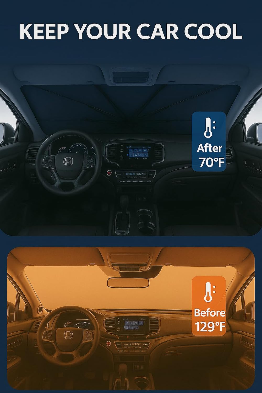 - Innovative Ice Crystal Material: The sunshade adopts a 4-layer design, which is thick enough to effectively block and reflect sunlight. After multiple uses, it is still strong and not easy to tear. The sunshade also uses innovative ice crystal materials to evenly distribute heat, quickly cool down, and keep your car cool all the time. You no longer have to worry about getting your seat or car handle scalded by high temperatures.