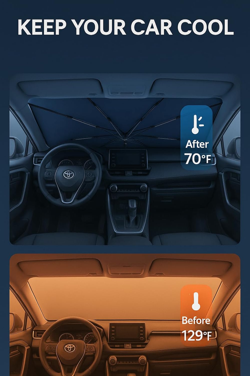 - Certified Sustainable. Customized Windshield Sunshade: Specially designed for the 2019-2025 Toyota RAV4 with precise mirror cutouts, providing 100% shading, carbon fiber handle, ensuring lightweight and durability while also having a fashionable feel. Our RAV4 windshield sunshade can protect the interior of your car from various light damage and prevent dashboard and seat degradation.
