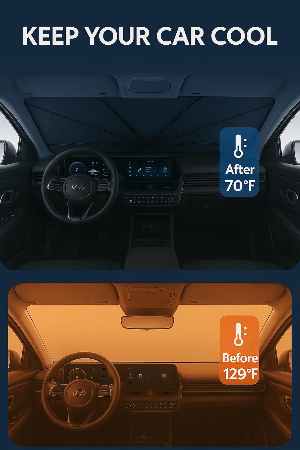 - Innovative Ice Crystal Material: The sunshade adopts a 4-layer design, which is thick enough to effectively block and reflect sunlight. After multiple uses, it is still strong and not easy to tear. The sunshade also uses innovative ice crystal materials to evenly distribute heat, quickly cool down, and keep your car cool all the time. You no longer have to worry about getting your seat or car handle scalded by high temperatures.