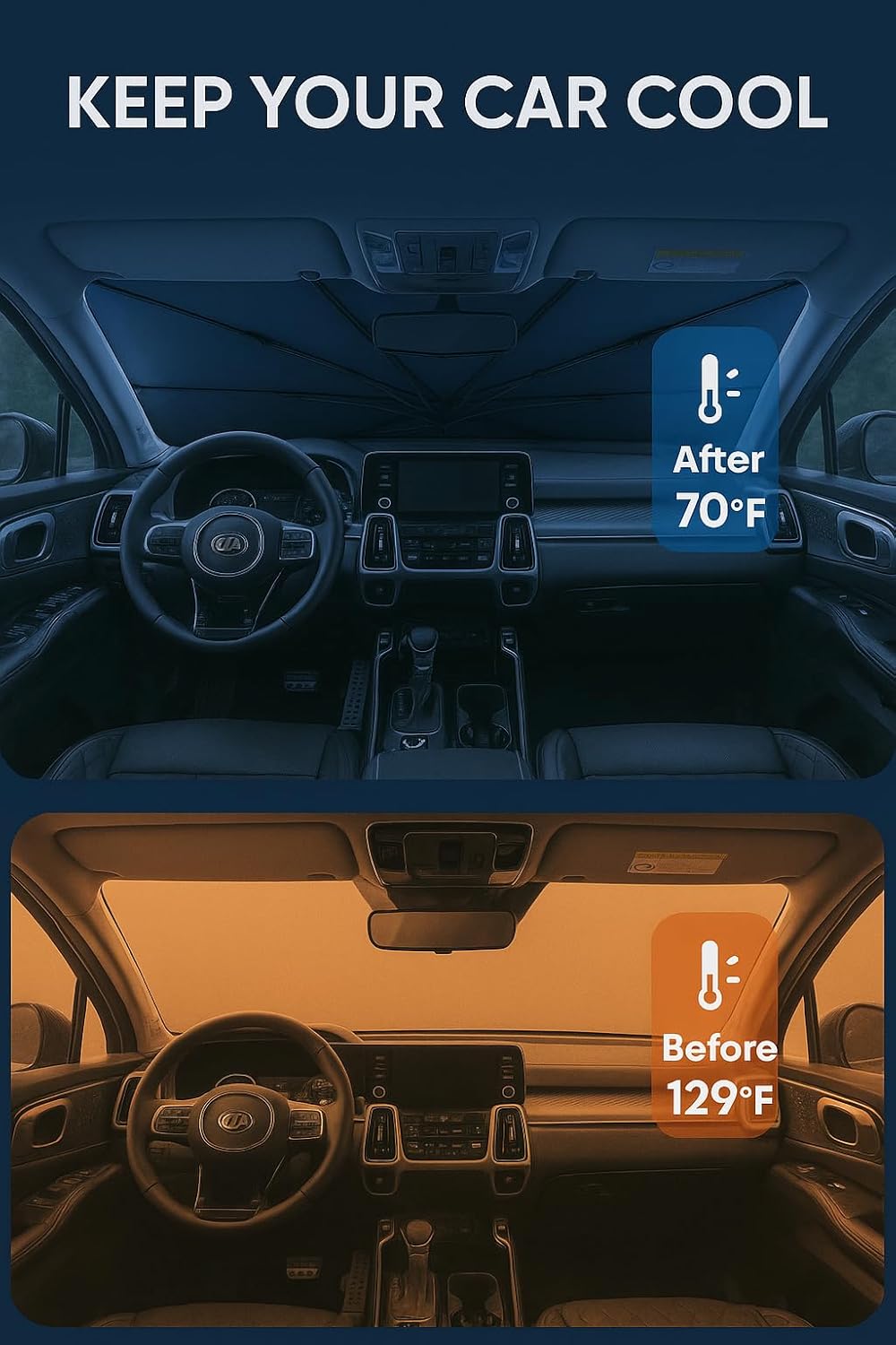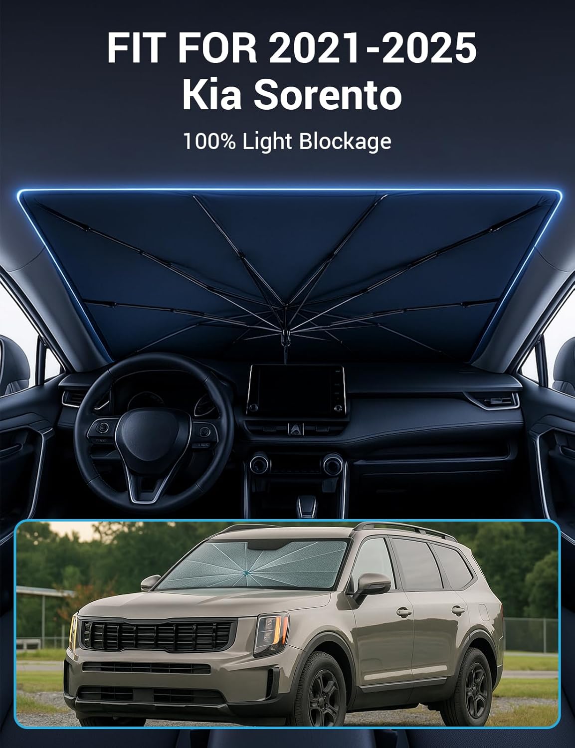 - Certified Sustainable. Customized Windshield Sunshade: Specially designed for the 2021-2025 Kia Sorento with precise mirror cutouts, providing 100% shading, carbon fiber handle, ensuring lightweight and durability while also having a fashionable feel. Our Sorento windshield sunshade can protect the interior of your car from various light damage and prevent dashboard and seat degradation.