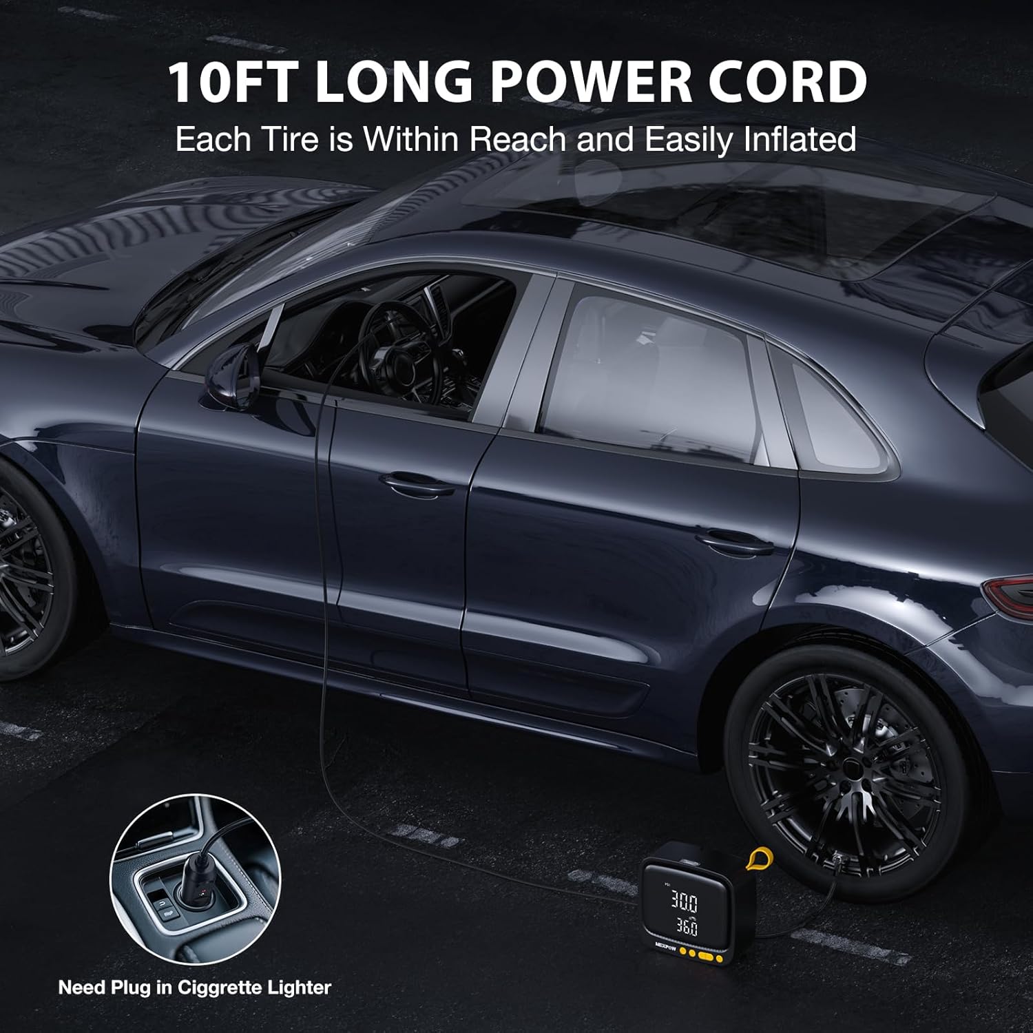 - ULTRA LONG POWER CORD AND COMPACT DESIGN: This car tire inflator is equipped with a 0.5m (1.6 feet) air hose and a 3m (9.8 feet) power cord, making it easy to connect to any tire. The integrated storage compartment on the back facilitates the storage of accessories and makes the tire inflator easier to carry. This convenient design brings a relaxed and easy inflation experience.