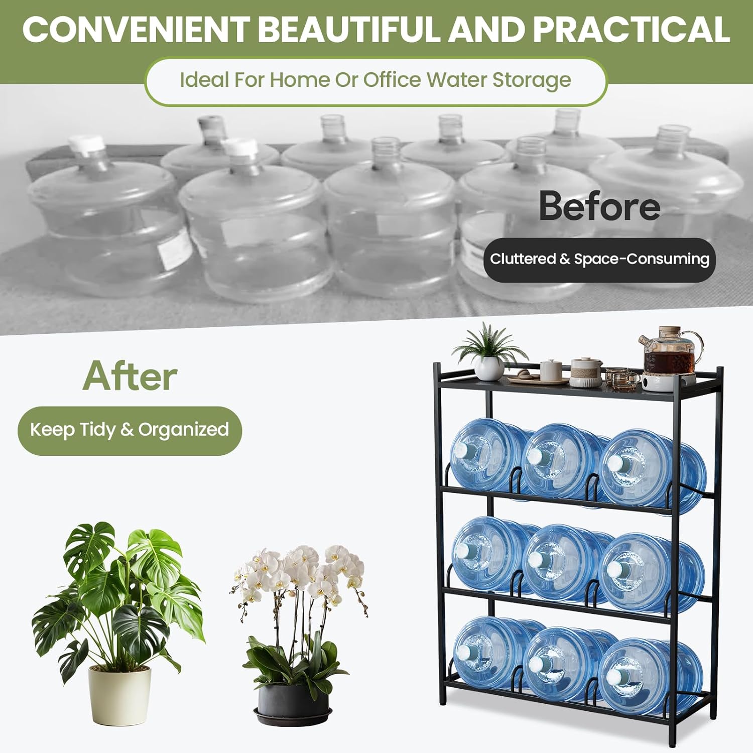 - 【Useful Top Shelf】Upgraded with a practical tabletop layer, this 5-gallon jug holder adds functionality for countertop water dispensers, coffee cups, decorations, and more. Elevate your storage solution with style and efficiency.
