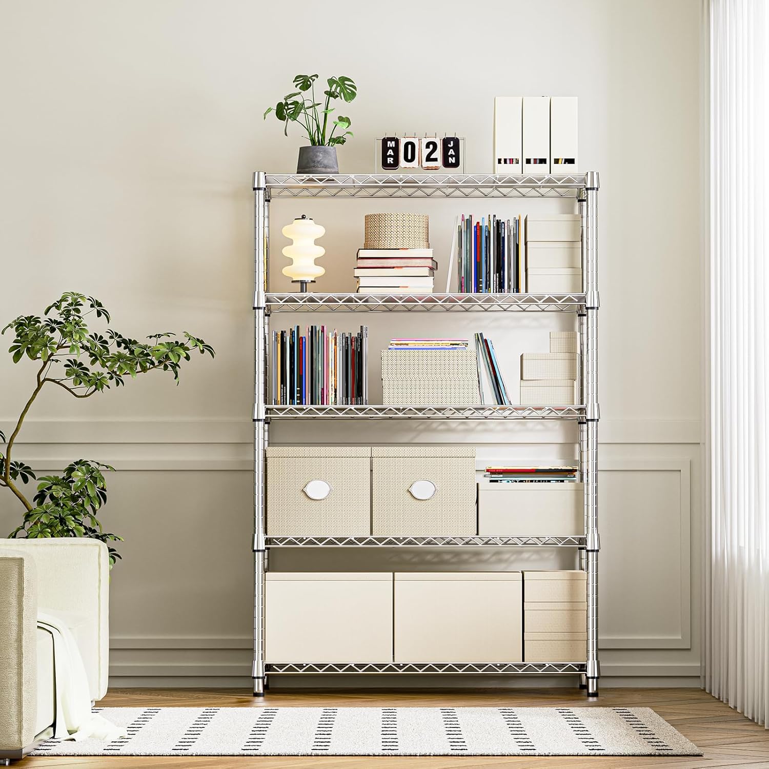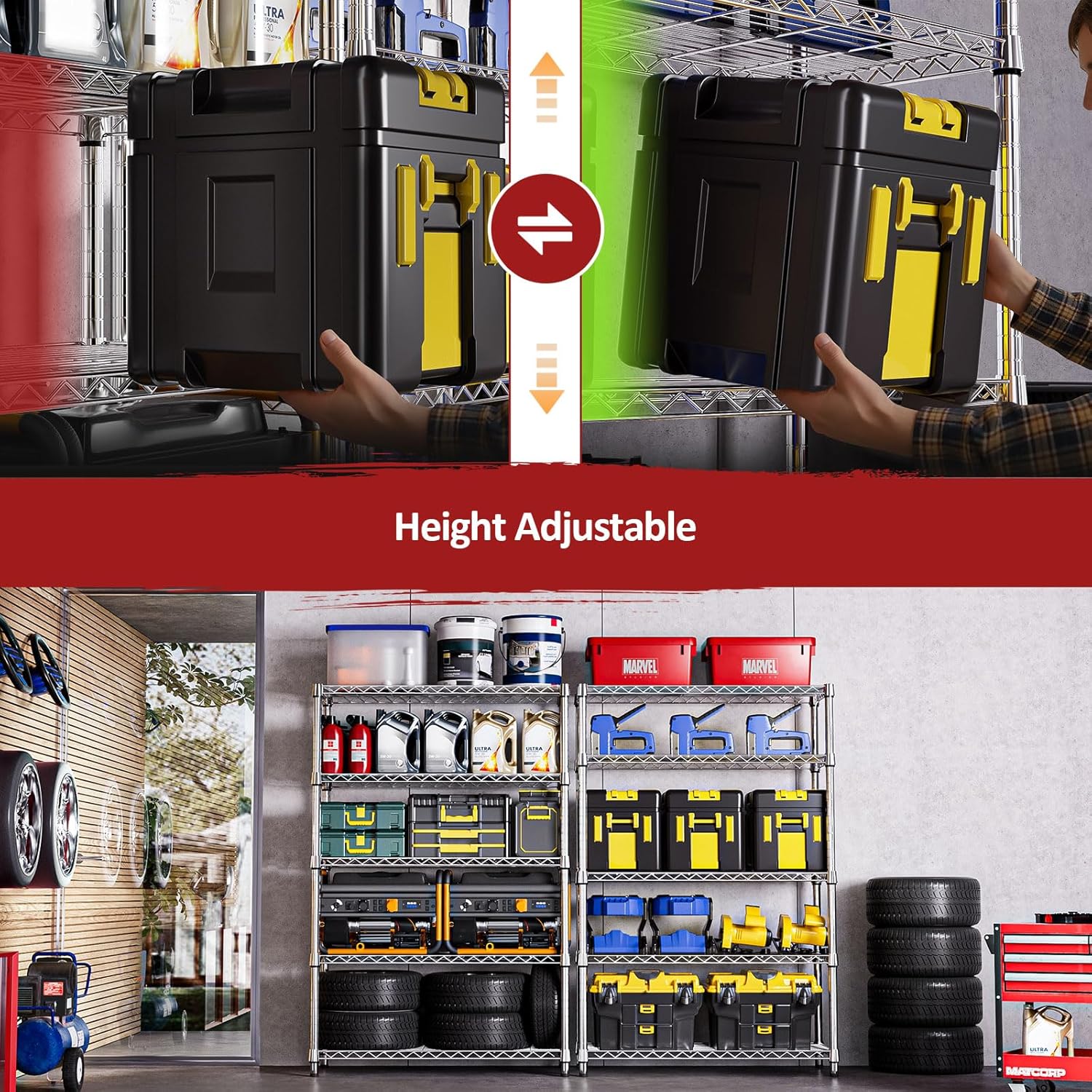 - ăAdjustable Shelves â Flexible for All NeedsăCustomize your storage your way. Each shelf can be easily adjusted in 1-inch increments to fit items of varying sizesâfrom bulky tools to compact kitchenware. This wire shelving unit adapts to your unique storage needs, creating a more organized and efficient space.