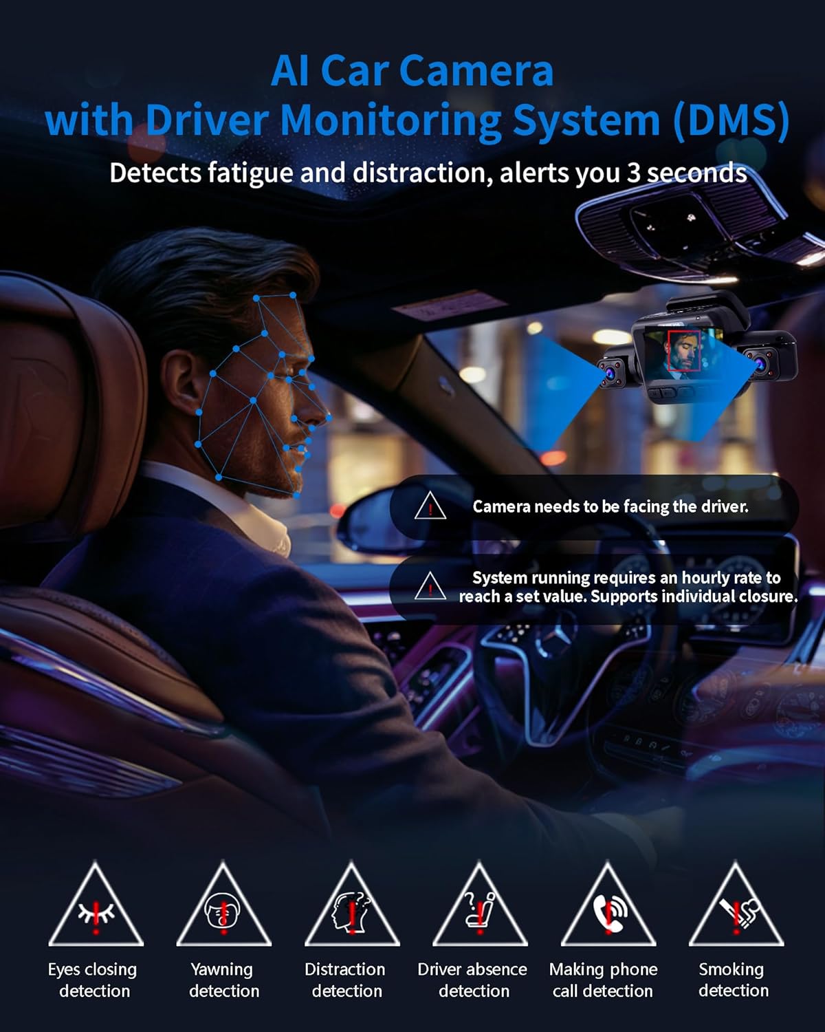 - 【AI Dash Camera with DMS】The V8 Ultra is AI Dash Cam with Driver Monitoring System, fatigue driving detection is an advanced AI in-vehicle safety technology that is primarily used to monitor driver behavior and status. The main functions include, distracted driving detection, yawning detection, driver absence detection, making phone call detection, and smoking detection. These features help to improve driving safety and comfort. Running the system requires the hourly speed to reach the set value