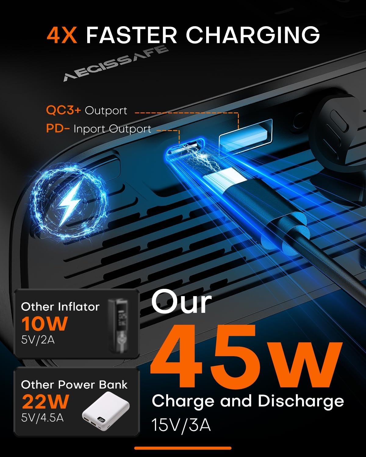 - âĄă45W Super Fast ChargingăAs a mobile power supply, equipped with 45W USB-C input and output port and 45W USB-A output port, which can quickly charge the other electronic devices; the power supply speed is 3 times faster than 99% of the air pumps on the market and 2 times faster than most mobile power supplies. car tire pump supports a maximum charging input of 45W and can be fully charged in 2 hours.