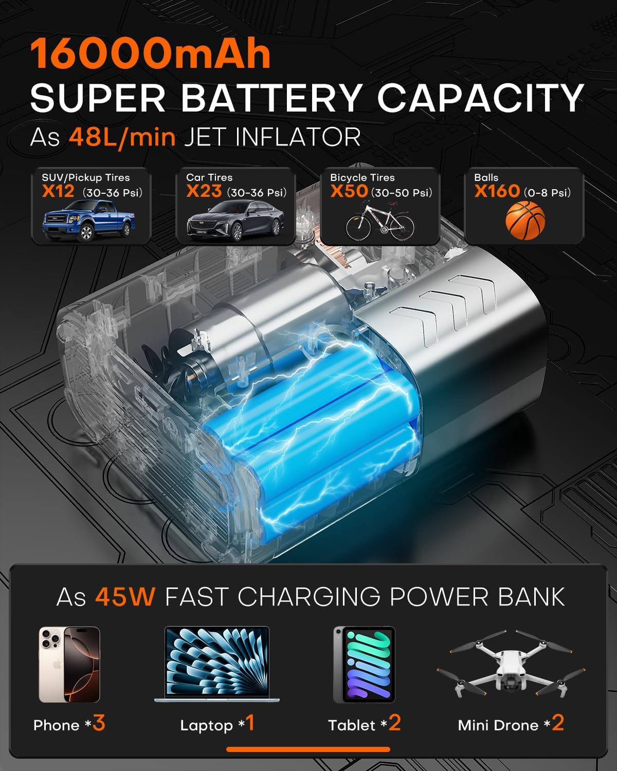 Tire Inflator Portable Air Compressor, 3X Faster Air Pump with APP, 160PSI 48LPM Electric Tire Pump with 16000 mAh Battery, 45W Faster Charging, Cordless Tire Inflator for Car SUV Pickup RV MPV