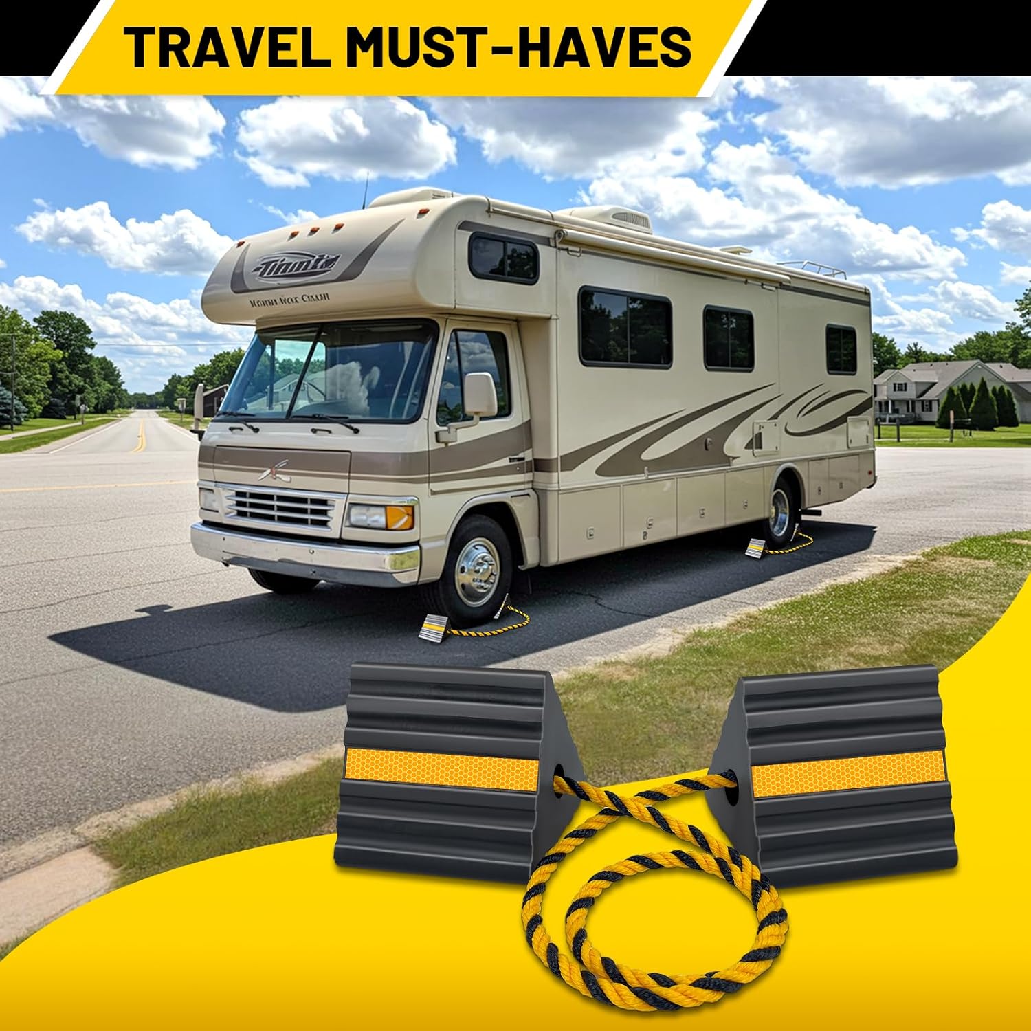 - Enhanced Visibility: Each wheel chock features three yellow reflective strips for increased visibility, even in low-light conditions. Keep your vehicle safe and visible at all times, whether you're parked in a dimly lit garage or outdoor setting