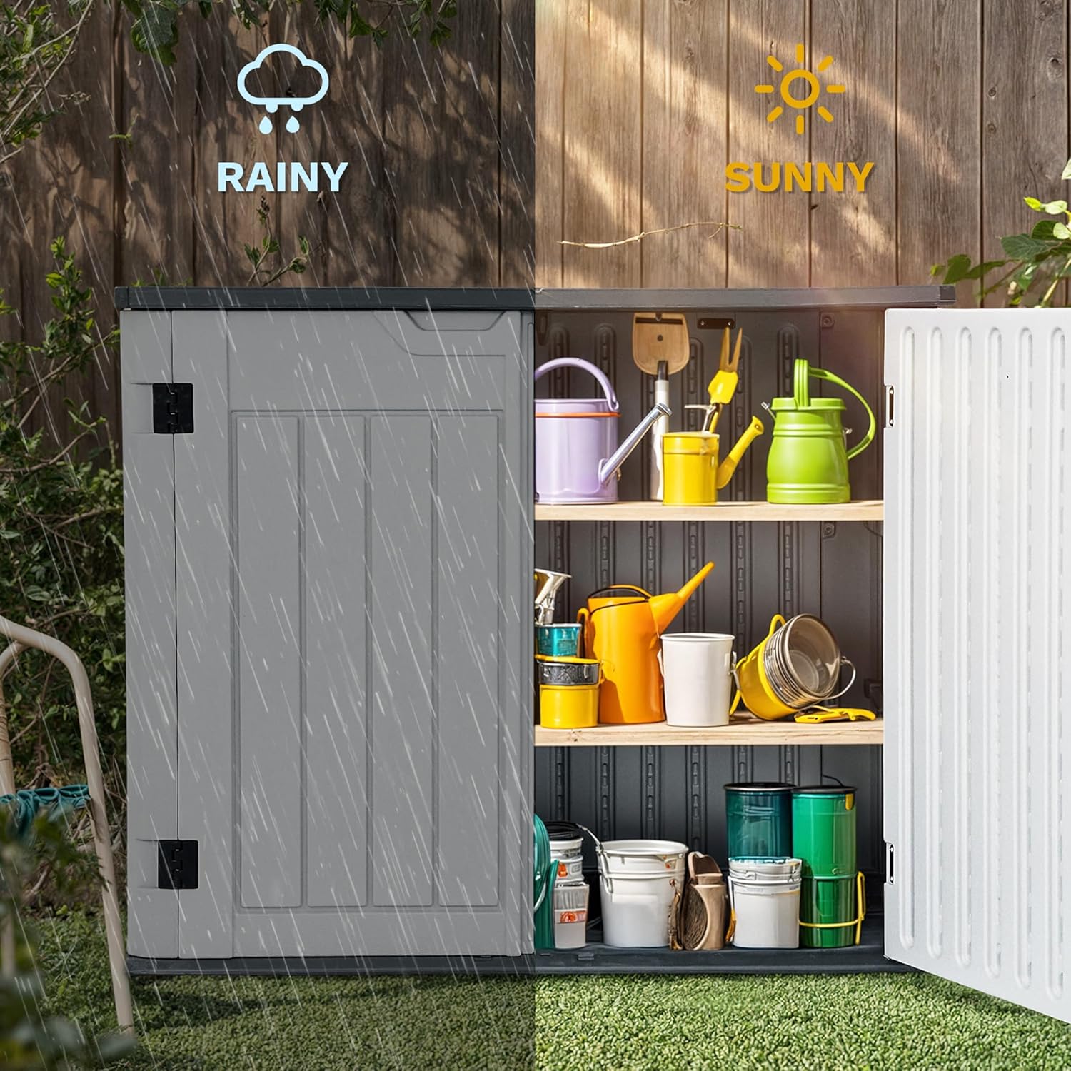 - Robust Construction: Boasting double-wall resin panels treated with cutting-edge technology, this outdoor storage solution offers enhanced wind and impact resistance; Its sturdy build ensures your valuable tools and equipment remain secure, without bending or puncturing