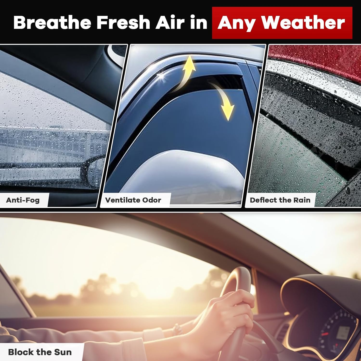 - ăImproved Ventilation and Air FlowăAllows fresh air to circulate through open windows while keeping the rain out or reduces heat. Reduce mirror and window fogging; reduce sun glare through side window. Dark Smoke translucent color will not obstruct the driver's view while driving