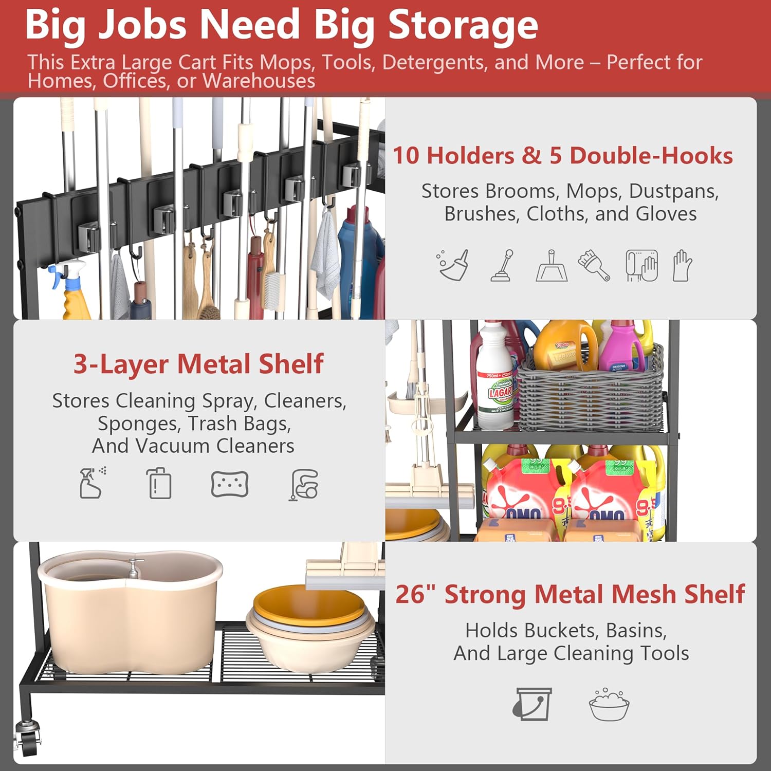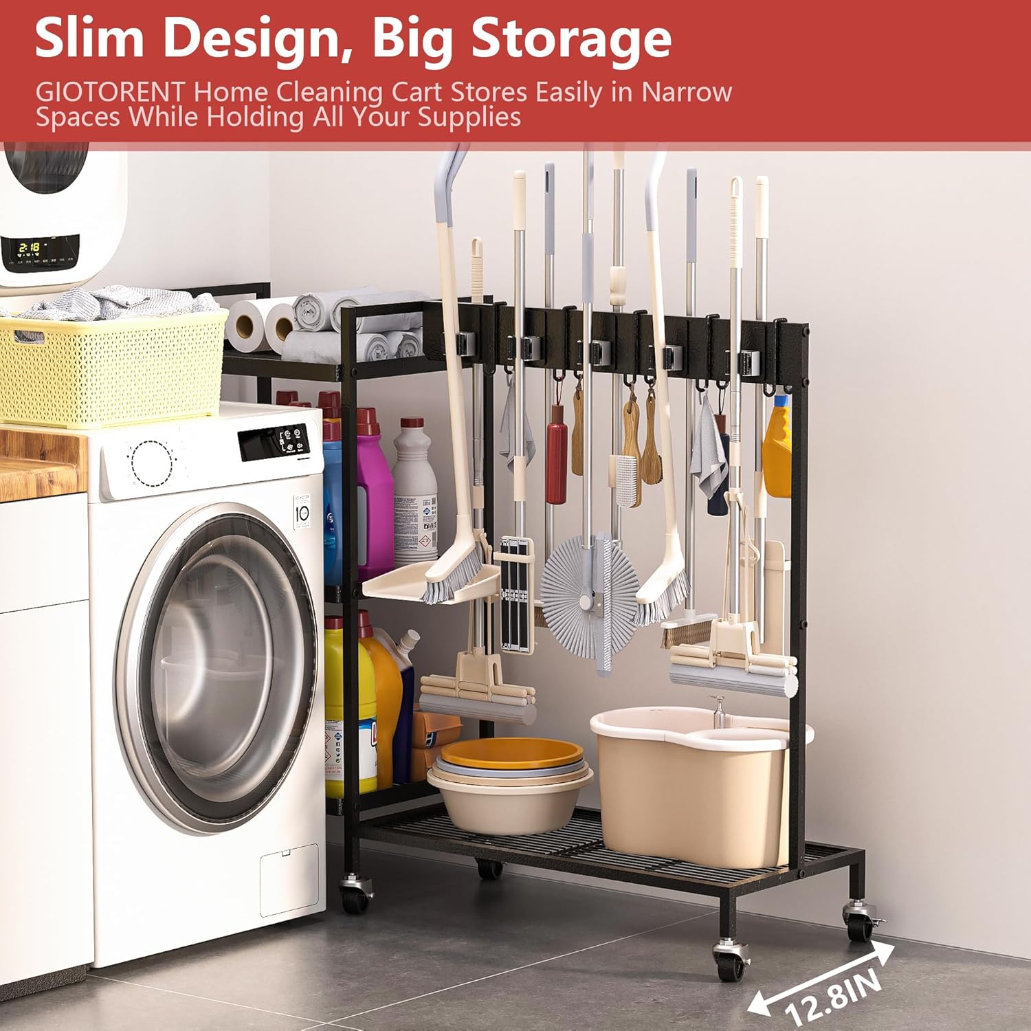 GIOTORENT Heavy Duty Metal Cleaning Cart with Wheels - 300lb Capacity Rolling Broom Holder & Supplies Organizer, 10 Adjustable Clips, 5 Double-Hooks, 3-Tier Shelves, Brakes for Home, Commercial, Black
