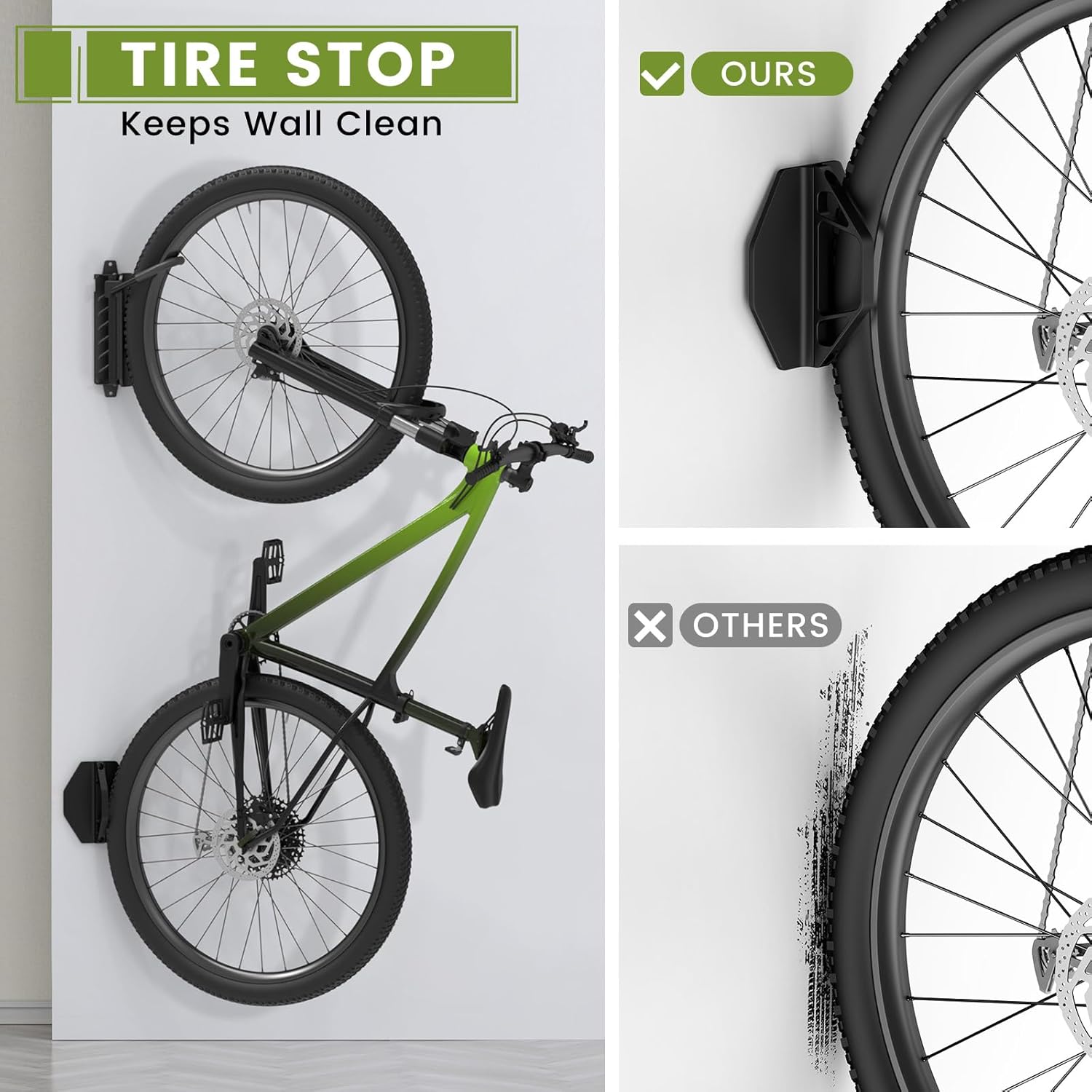 - Protective Coatings and Pads: The bike hook features protective coating and rear wheel stop pad that not only protects the integrity of your bike frame, but also prevents scratches and damage to walls. This thoughtful addition gives you peace of mind that your bike and your home are keep original.