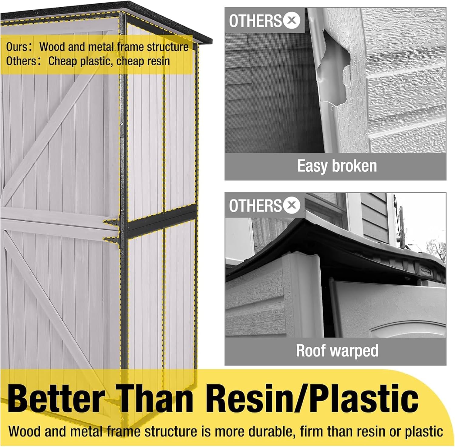 - Compact Size with Floor Base β Sized at 4.6 x 2.42 FT, this shed fits easily in small spaces like patios, decks, or narrow sides of the house. Built-in floor keeps items off the ground, protecting them from moisture
