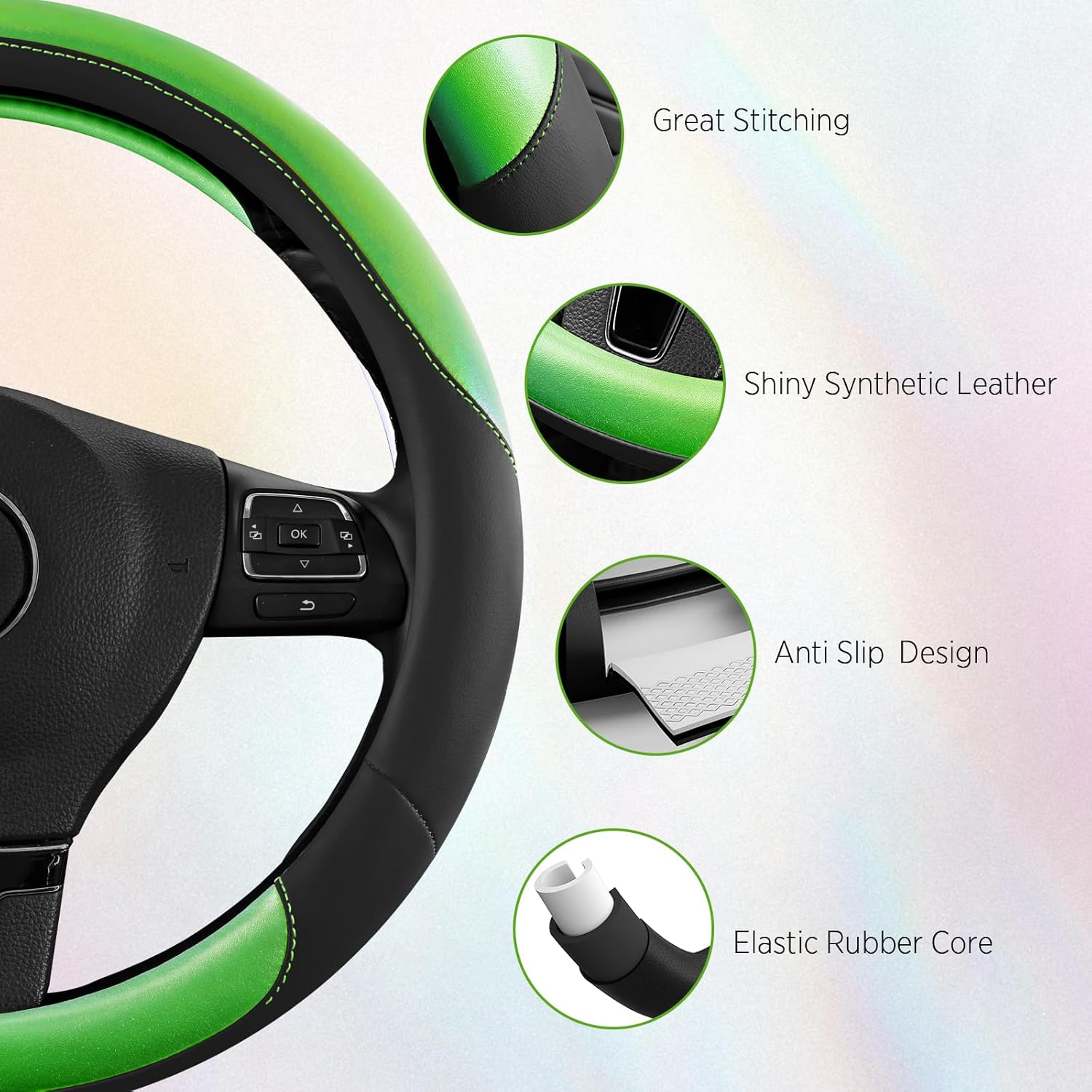 Road Comforts Steering Wheel Cover – Breathable Leather Steering Wheel Cover, Anti-Slip Grip, Universal Fit 14.5” to 15”, Heat & Cold Resistant for Cars, SUVs, and Trucks – Black & Green