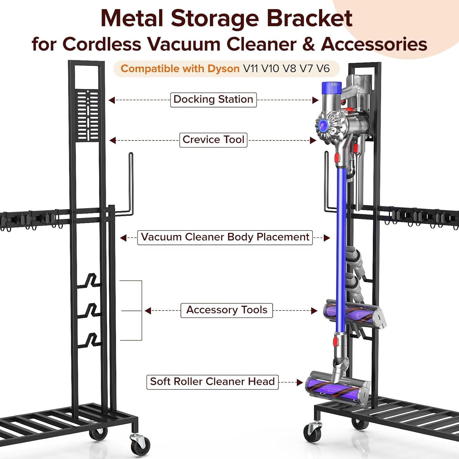 - Versatile Vacuum Stand: The rolling cart is designed with a metal storage bracket for cordless vacuum Cleaner & accessories, Compatible with Dyson V15 V12 V11 V10 V8 V7 V6. Ensures your vacuum is securely stored and easily accessible.
