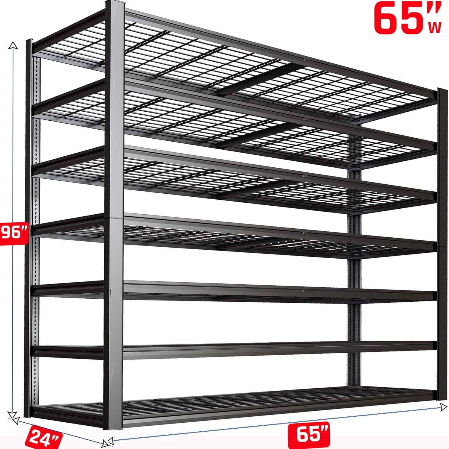 - 【7 Tier 65 "W x 96"H x 24"D Wide Storage Shelves heavy duty】Large heavy duty garage shelving is suitable for garage, warehouse, basement,Library, commerical, industrial etc. The 7 tier metal shelves for storage shelves expands your storage space, makes your home clean .
