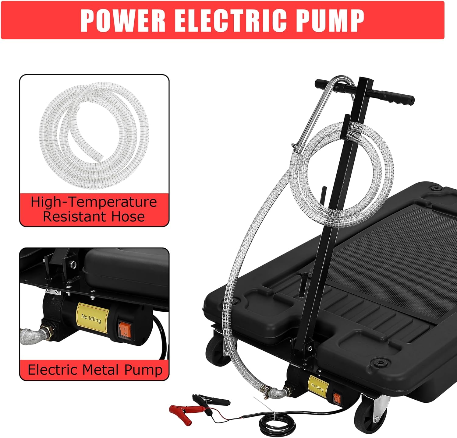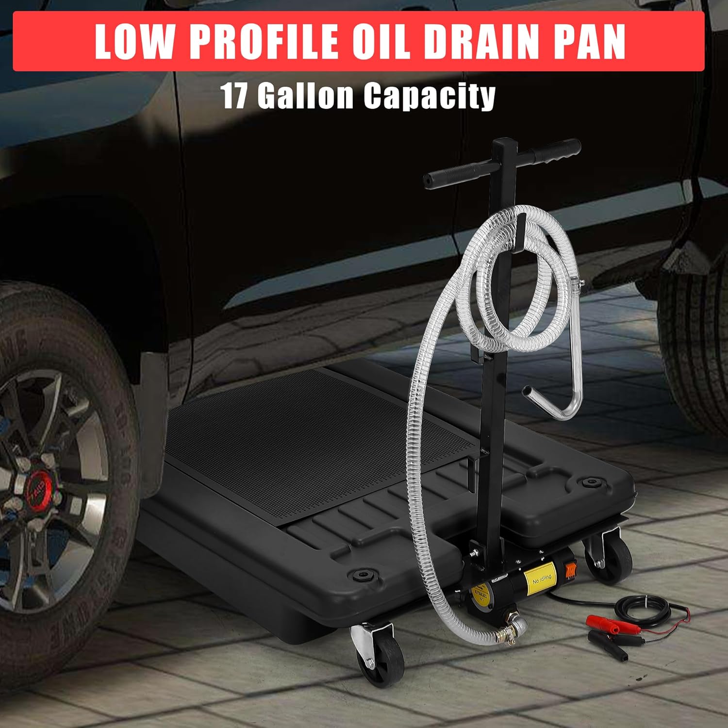 17 Gal Electric Oil Drain Pan, Low Profile Mobile Oil Changing Pan with Hand Pump, 8 Ft Hose & Quick Drain Valve, Leak-Proof Design for Truck Car Motorcycle, Garage Workshop Use