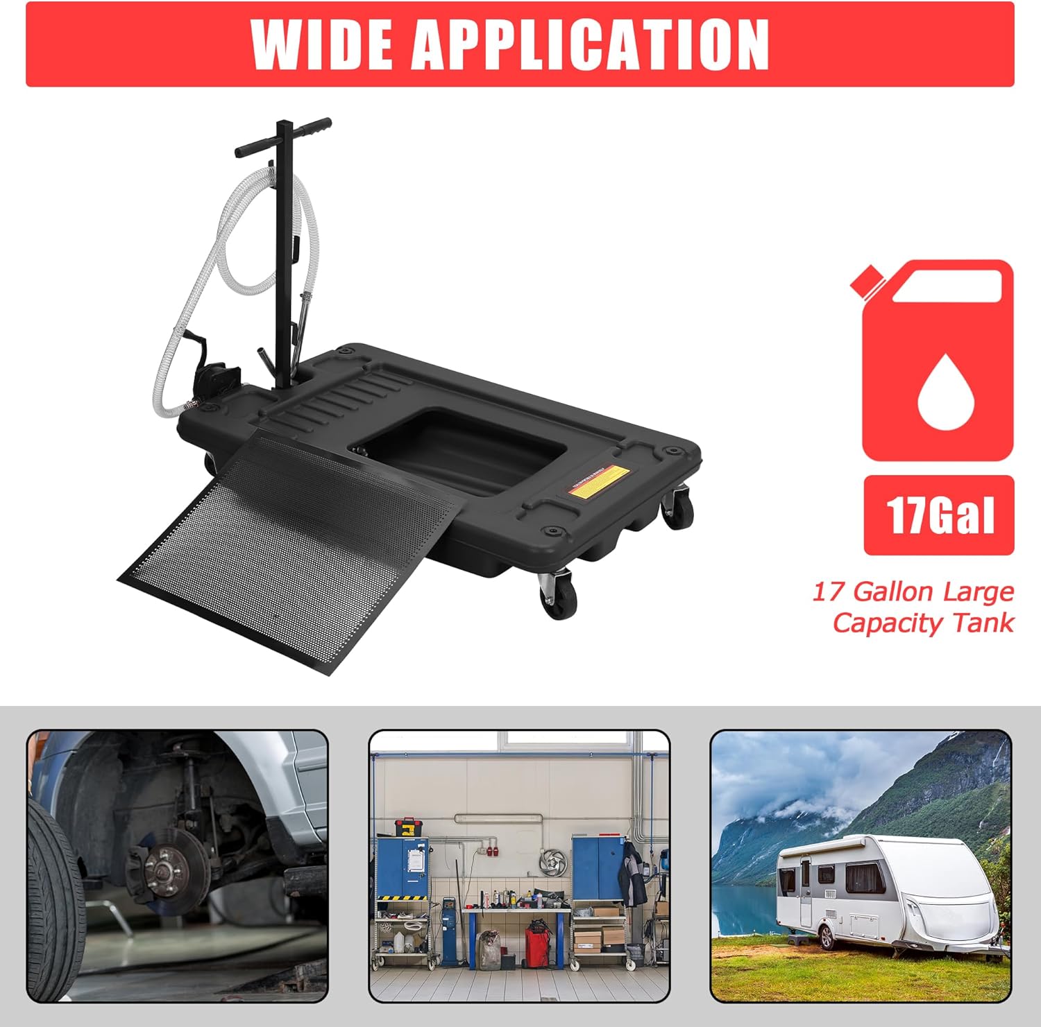 - --Generous Capacity: This low-profile oil drain pan holds up to 17 gallons, perfect for trucks, cars, motorcycles, and more. Its large size means fewer trips to empty, boosting efficiency whether you're working in a busy garage or at home