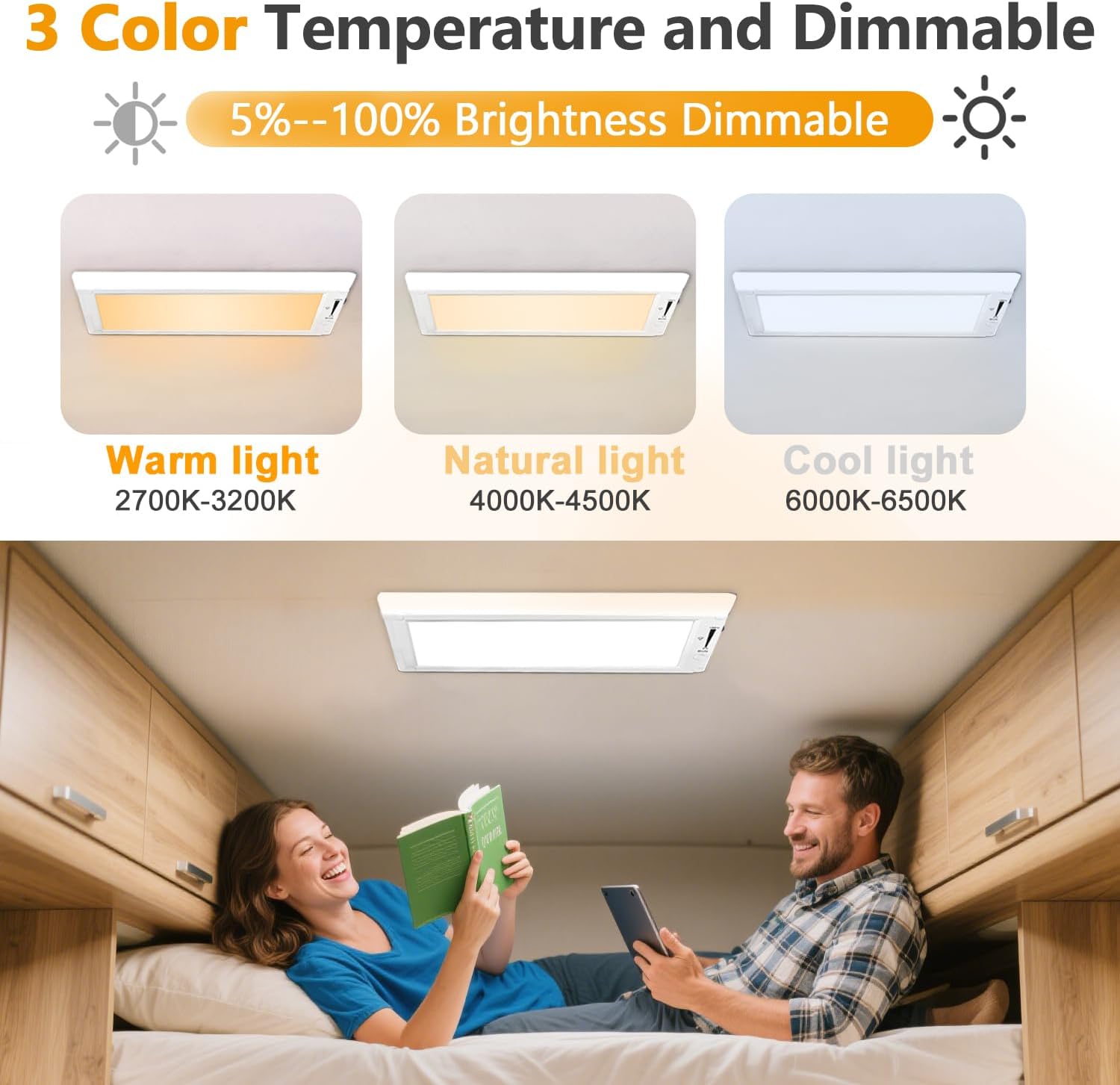 - Easily Adjustable Brightness From 5% to 100%:Press the MODE button,followed by cold/natural/warm light and turn off,you can also press and hold the button for 2 seconds to directly turn off the RV LED Interior Light,which is easy to operate.The dimming button is carefully crafted through ergonomic research and design, and is seamlessly fixed on the top, making it easy to activate and set the brightness from 5% to 100% as you want,providing you with a personalized lighting experience.
