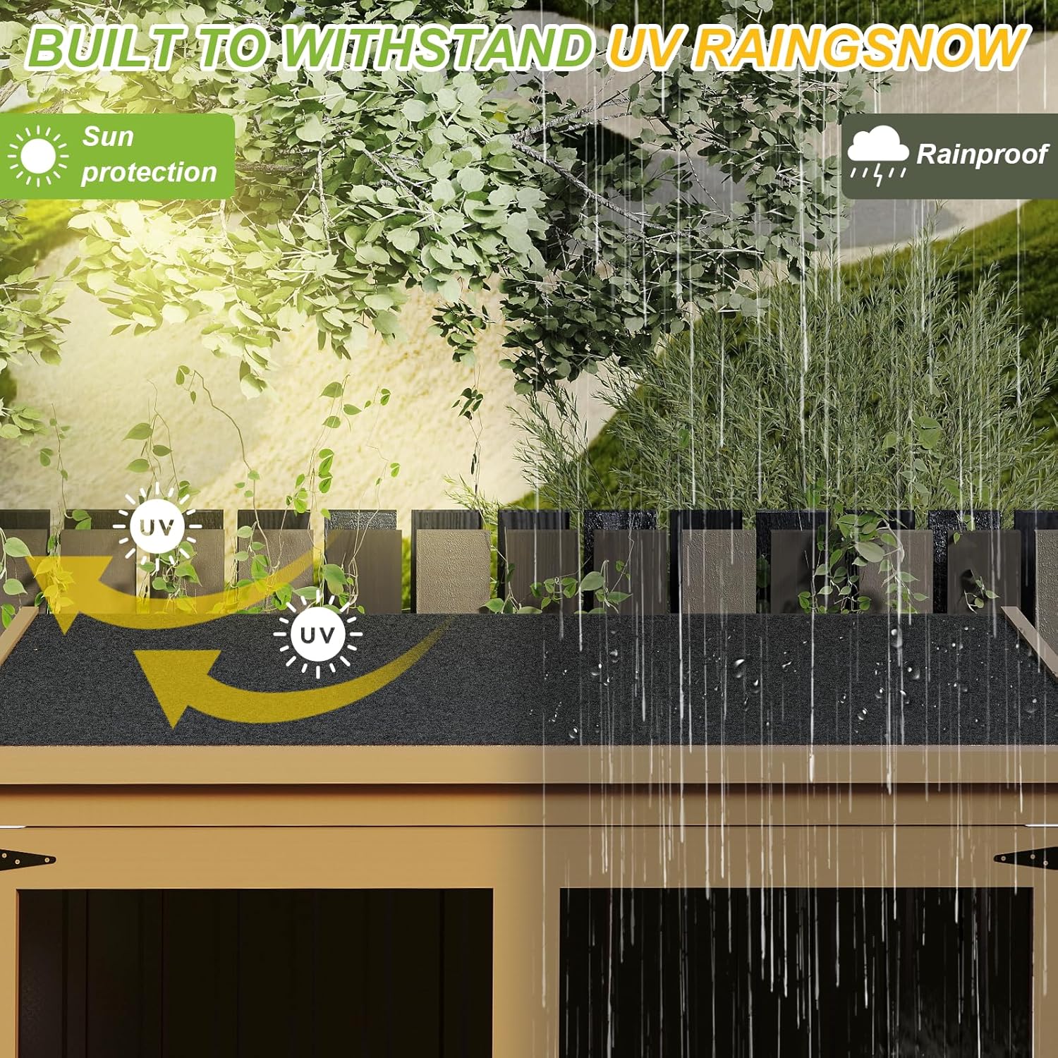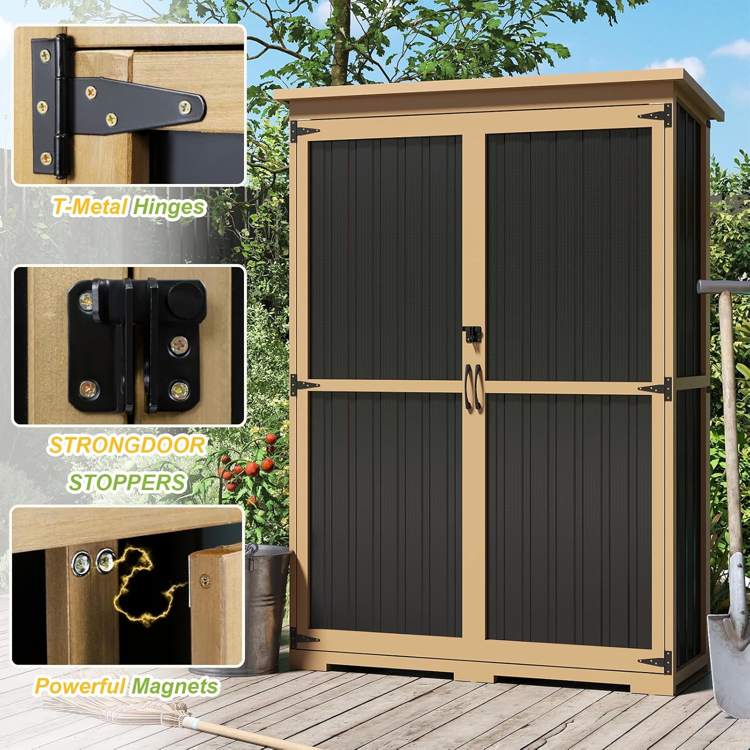 - Outdoor Storage Cabinet Built to Last-Crafted with a durable fir wood framework and rust-resistant metal panels, this shed combines natural strength with modern design. It's engineered to survive rain, sun, and wind while keeping your tools, gear, and essentials safe for years.