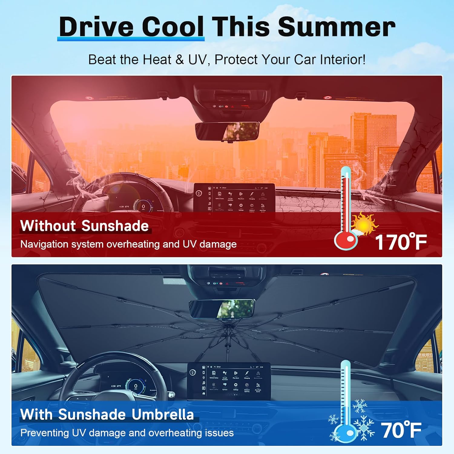 - 3. Enhanced Durability and Stability: Our 2024 2025 ZDX Windshield Umbrella uses 10 glass fiber ribs for high strength, heat resistance, and anti-rust performance. Silicone strips withstand 200°C, ensuring durable shade and interior protection