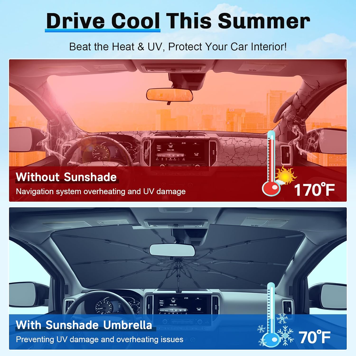 - 3. Enhanced Durability and Stability: Our 2024 2025 Frontier Windshield Umbrella uses 10 glass fiber ribs for high strength, heat resistance, and anti-rust performance. Silicone strips withstand 200°C, ensuring durable shade and interior protection