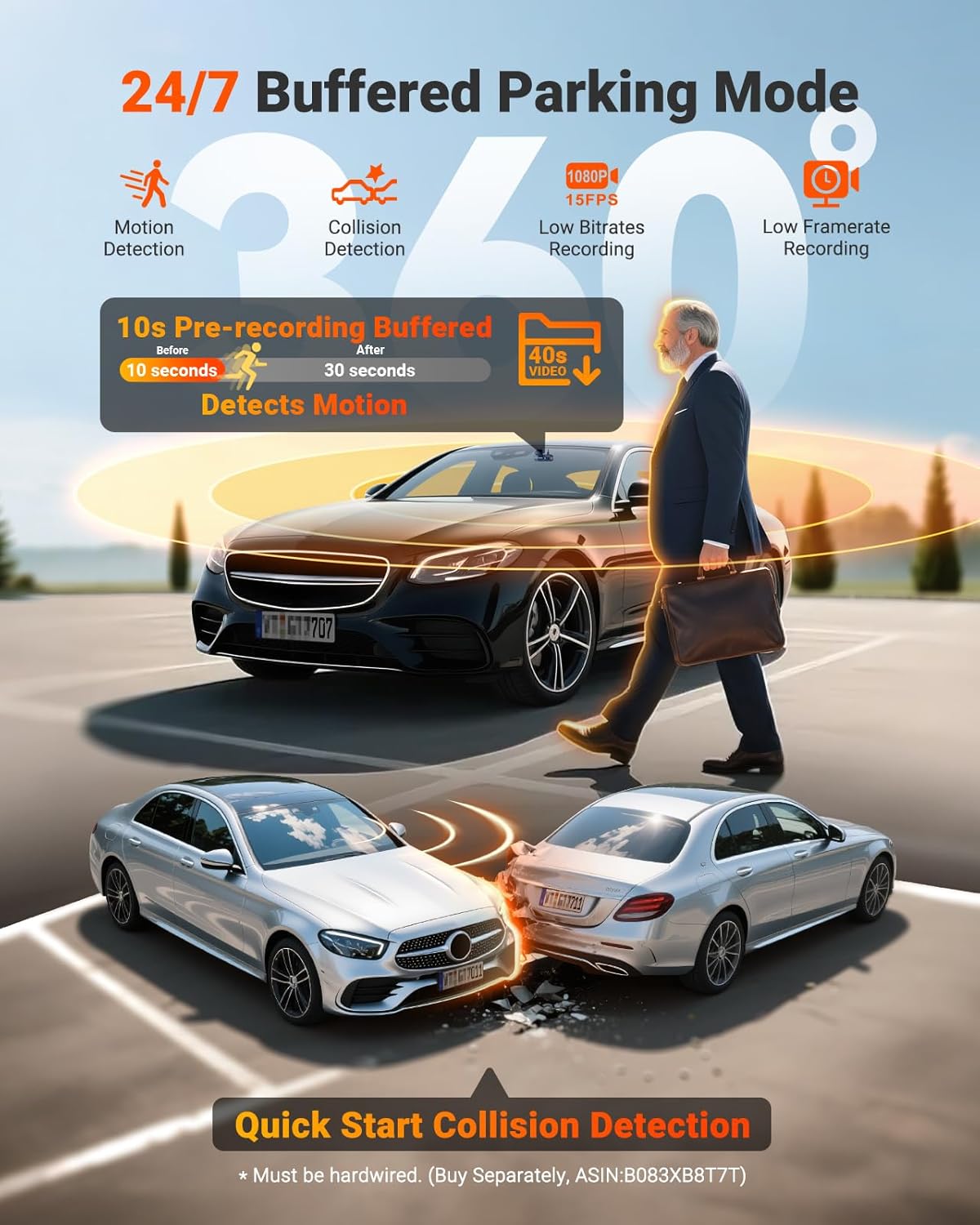 - [ 24/7 Buffered Parking Mode ] N5S automatically activates parking mode when you turn off the ignition, recording suspicious motion or collisions around your parked vehicle—providing vital evidence for vandalism, scratches, or break-ins. Our exclusive 10-second pre-recording buffered motion detection ensures complete event capture. Quick-start collision detection guarantees timely evidence preservation. Requires hardwiring (Hardwire Kit sold separately, ASIN: B083XB8T7T).