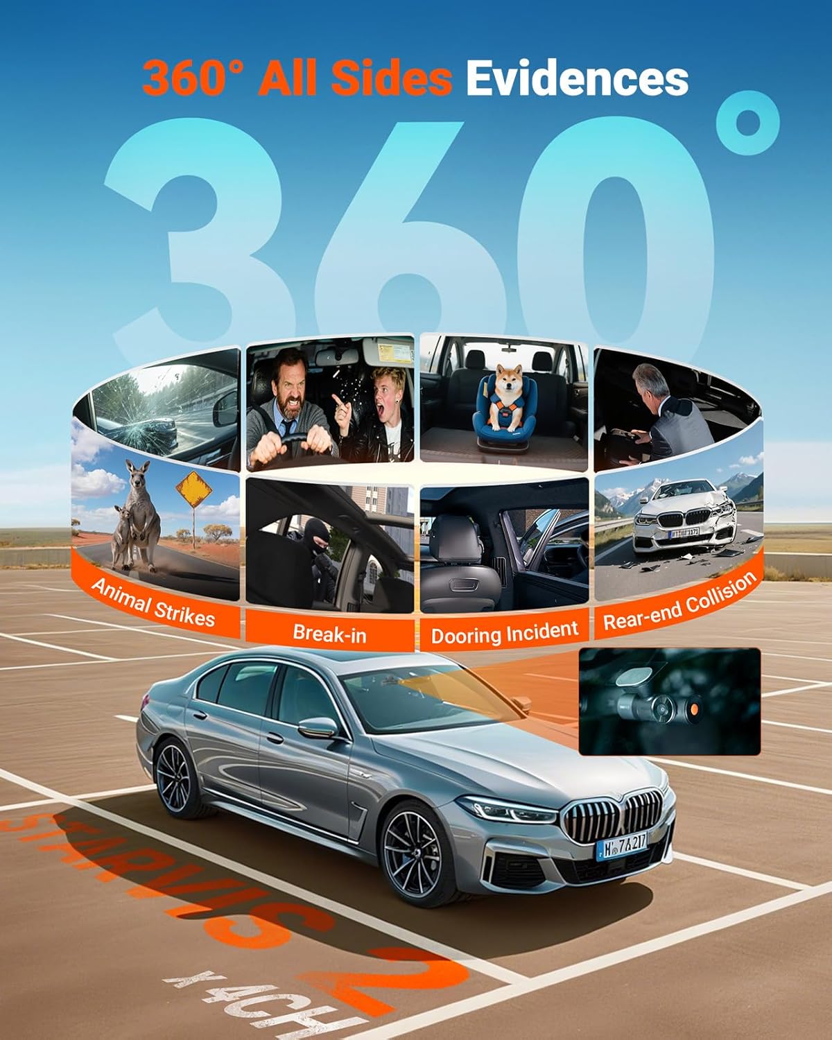 - [ 4 Channel 360° Full Coverage ] Experience complete 360° protection with our advanced 4 channel dash cam, eliminating blind spots on the road and inside your vehicle. Featuring a powerful dual-core processor, this dashcam records in stunning 2.7K+1080P+1080P+1440P resolution, with flexible recording modes (1CH/2CH/3CH/4CH) to adapt to any driving scenario. From daily commutes to long road trips, this all-in-one surveillance solution provides effortless driving safety and legal protection.