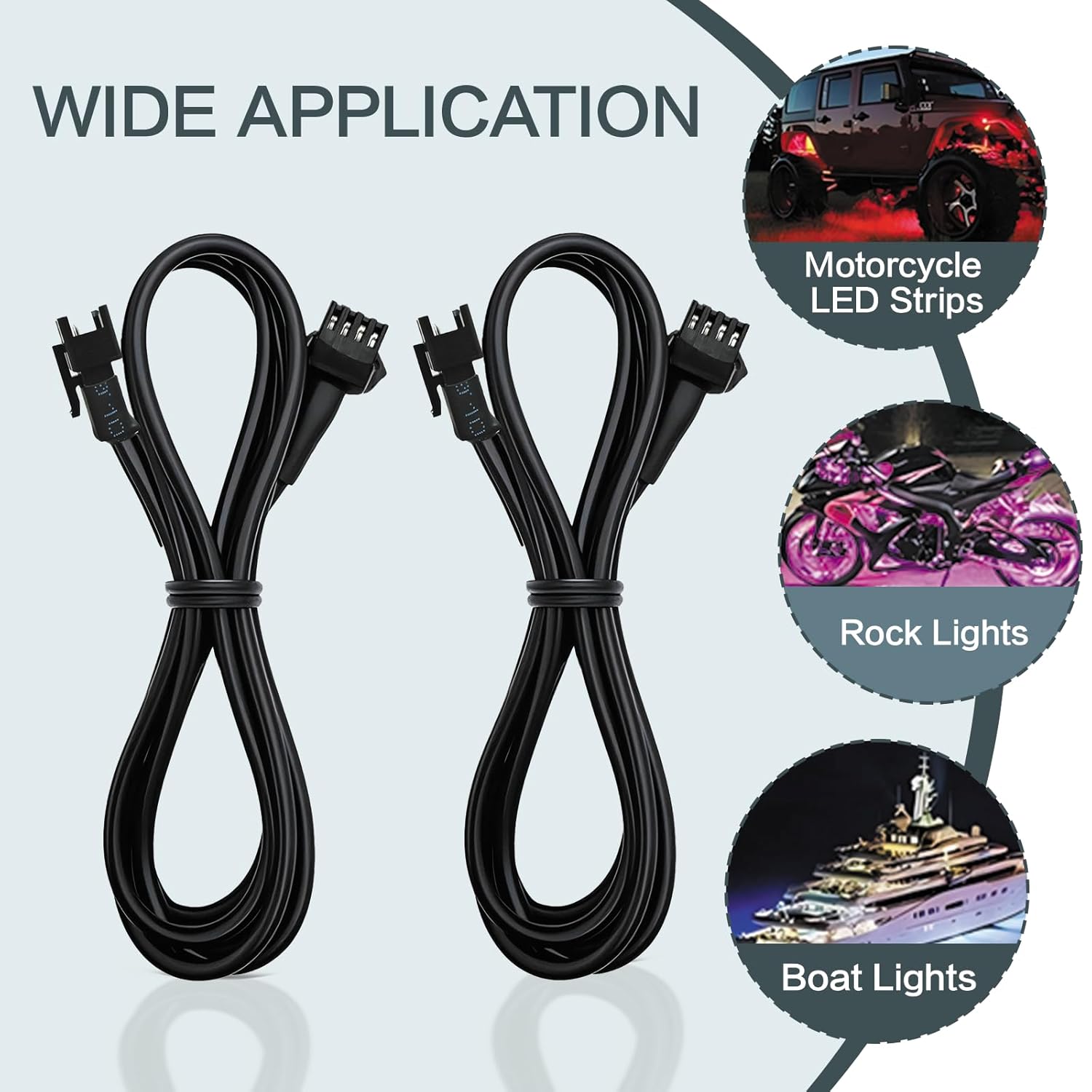 - Universal Vehicle Lighting Expansion: Extend the reach of your lighting effortlessly! Use these cables seamlessly with motorcycle fog lights LED kits, motorcycle LED underglow kits, rock lights for trucks, ATVs, cars, or boats. Achieve greater installation flexibility and dependable connections.