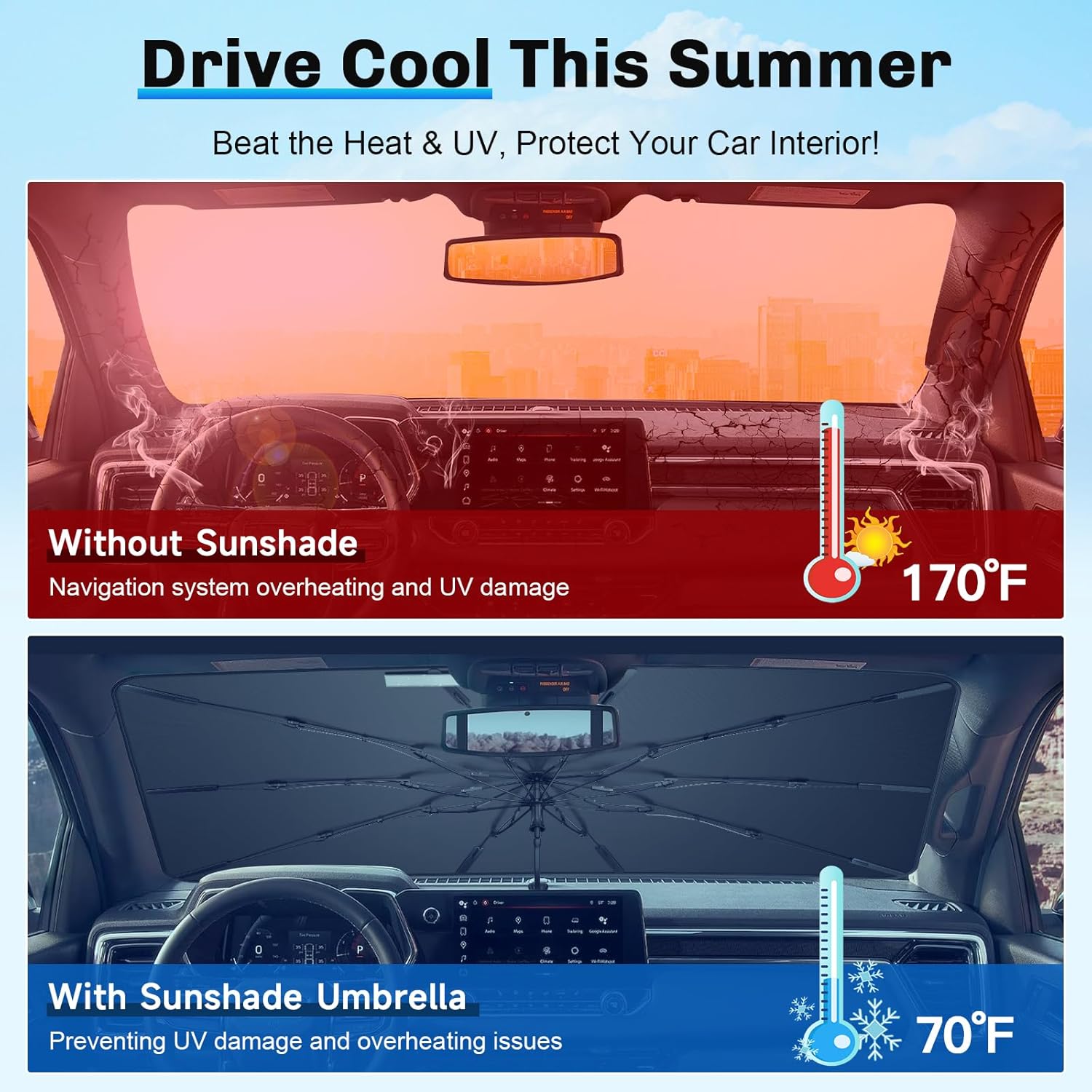- 3. Enhanced Durability and Stability: Our 2024 2025 Colorado Windshield Umbrella uses 10 glass fiber ribs for high strength, heat resistance, and anti-rust performance. Silicone strips withstand 200°C, ensuring durable shade and interior protection