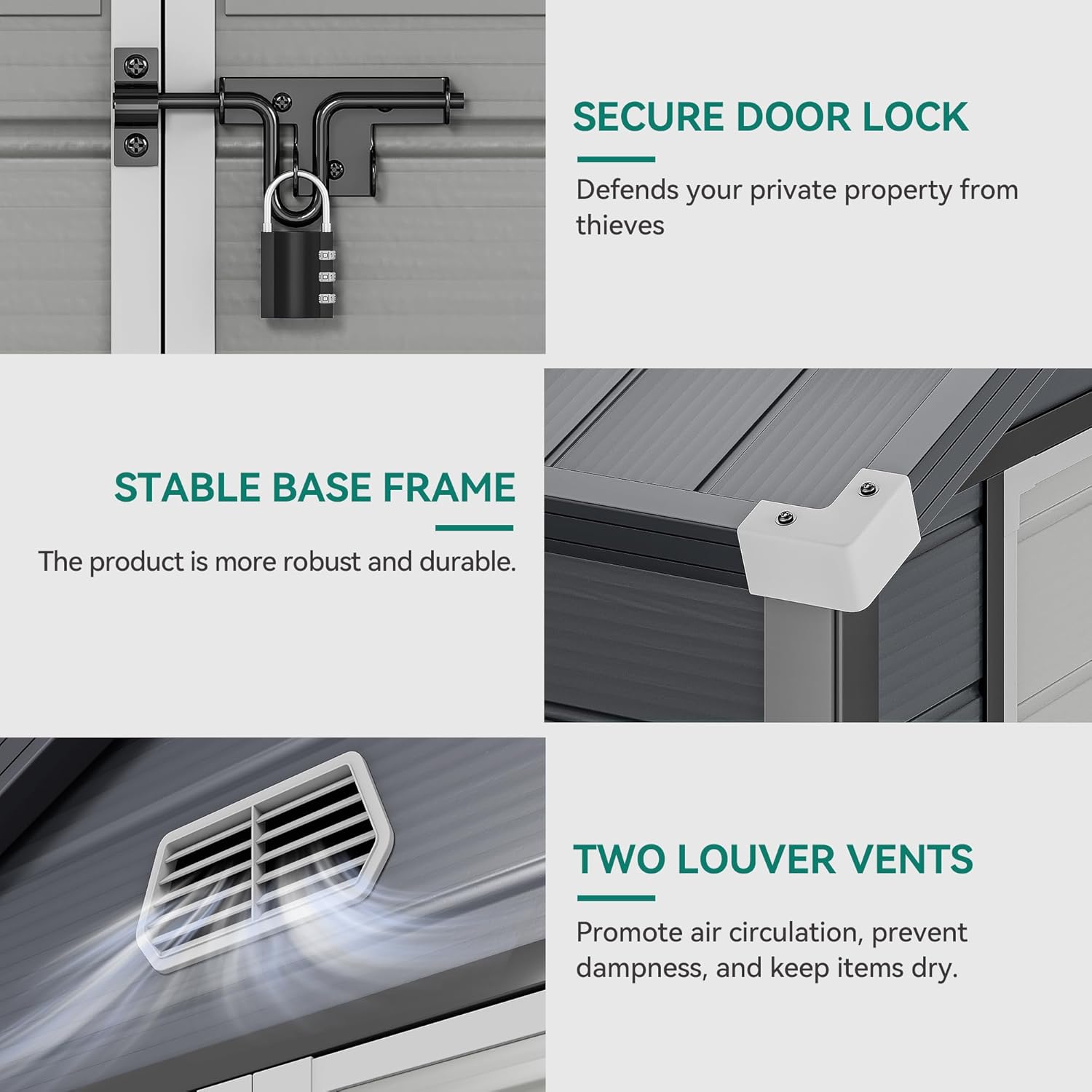 - Designed for Outdoors: Made from weather-resistant thermoplastics, this garden shed resists deformation, cracking, fading, corrosion, water, and UV rays, ensuring durability and minimal maintenance; Note that the floor is not included
