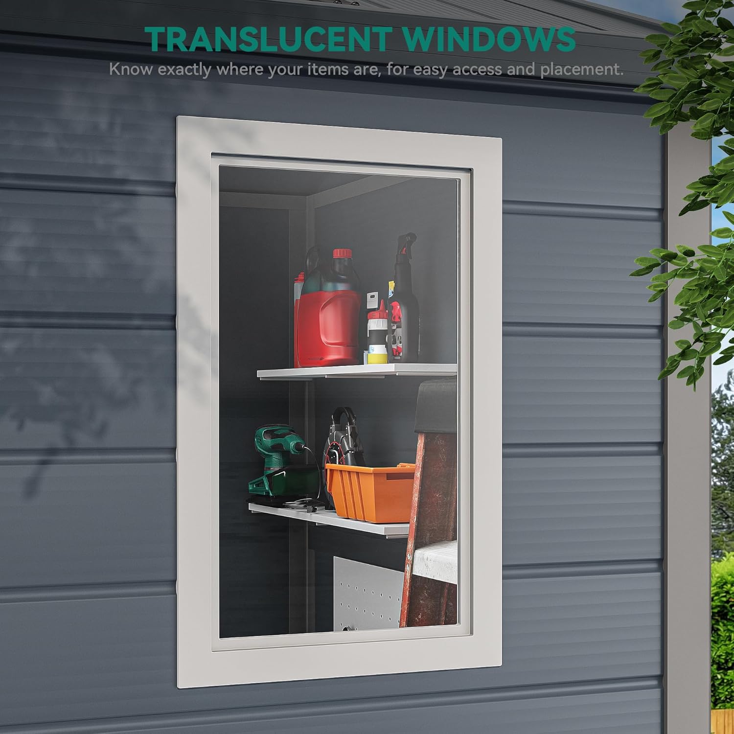 - Ventilated & Transparent: Our garden tool storage shed features a lockable door for secure storage, translucent side windows to allow natural light in, louvered vents promote airflow, and the sloped roof prevents water buildup while facilitating drainage
