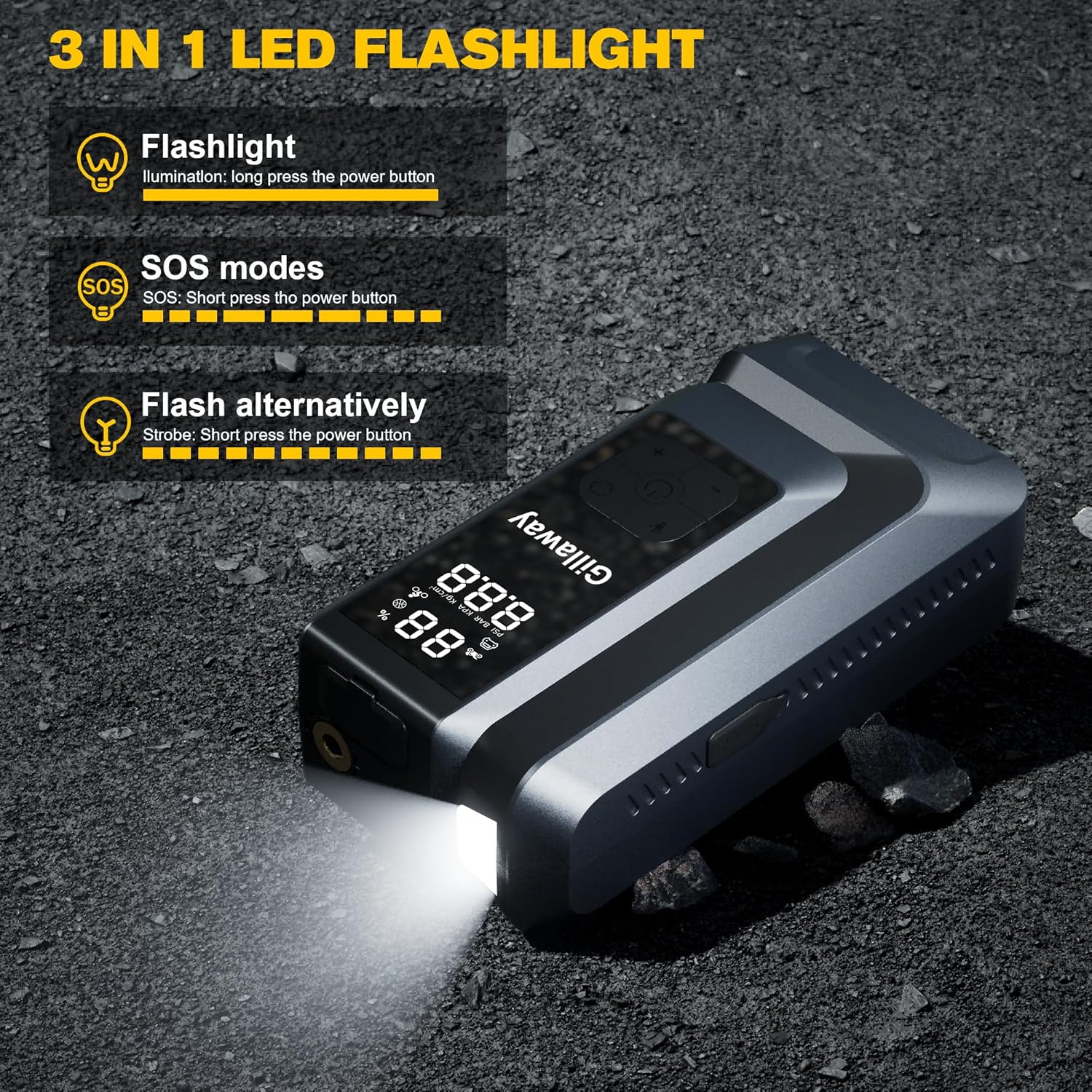 - ă7-IN-1 ALL-ROUND JUMP STARTERăThe car battery jump starter highlights 7 integrated premium functions transcending general jump starters. It's a car jumper starter portable, portable air compressor, pressure gauge, portable power bank, and 3-mode lights (flashlight, strobe, SOS) . Portable, versatile and must-have road trip car Accessoriesfor outdoors or emergencies.