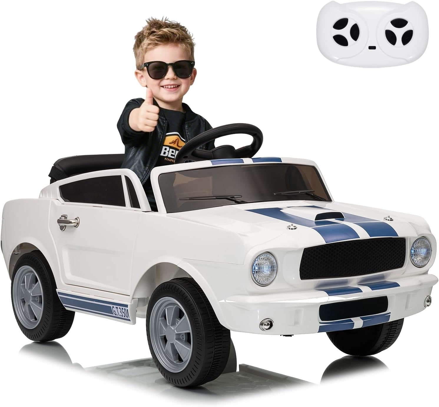 - Authentic Shelby GT350 Ride-On Car for Kids. Let your child experience the thrill of driving with this officially licensed 12V Shelby GT350 ride-on car. Featuring realistic styling details, plush seating, and eye-catching LED lights, this electric vehicle delivers safe and exciting adventures for young drivers