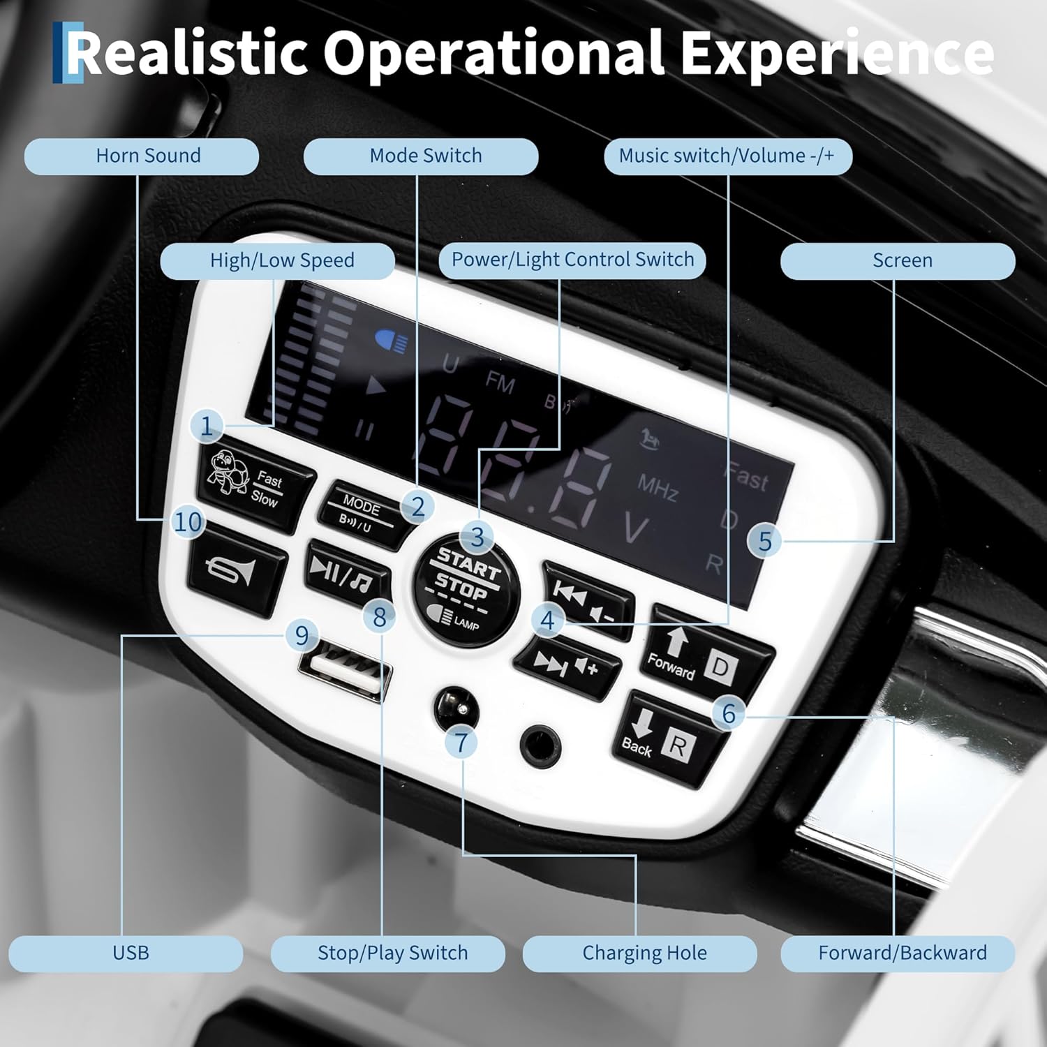 - Interactive Entertainment Features. This exciting ride-on car keeps kids engaged with built-in music, realistic horn sounds, and speed variations - plus a USB port to play their favorite songs. The convenient battery meter helps parents monitor power levels for uninterrupted fun