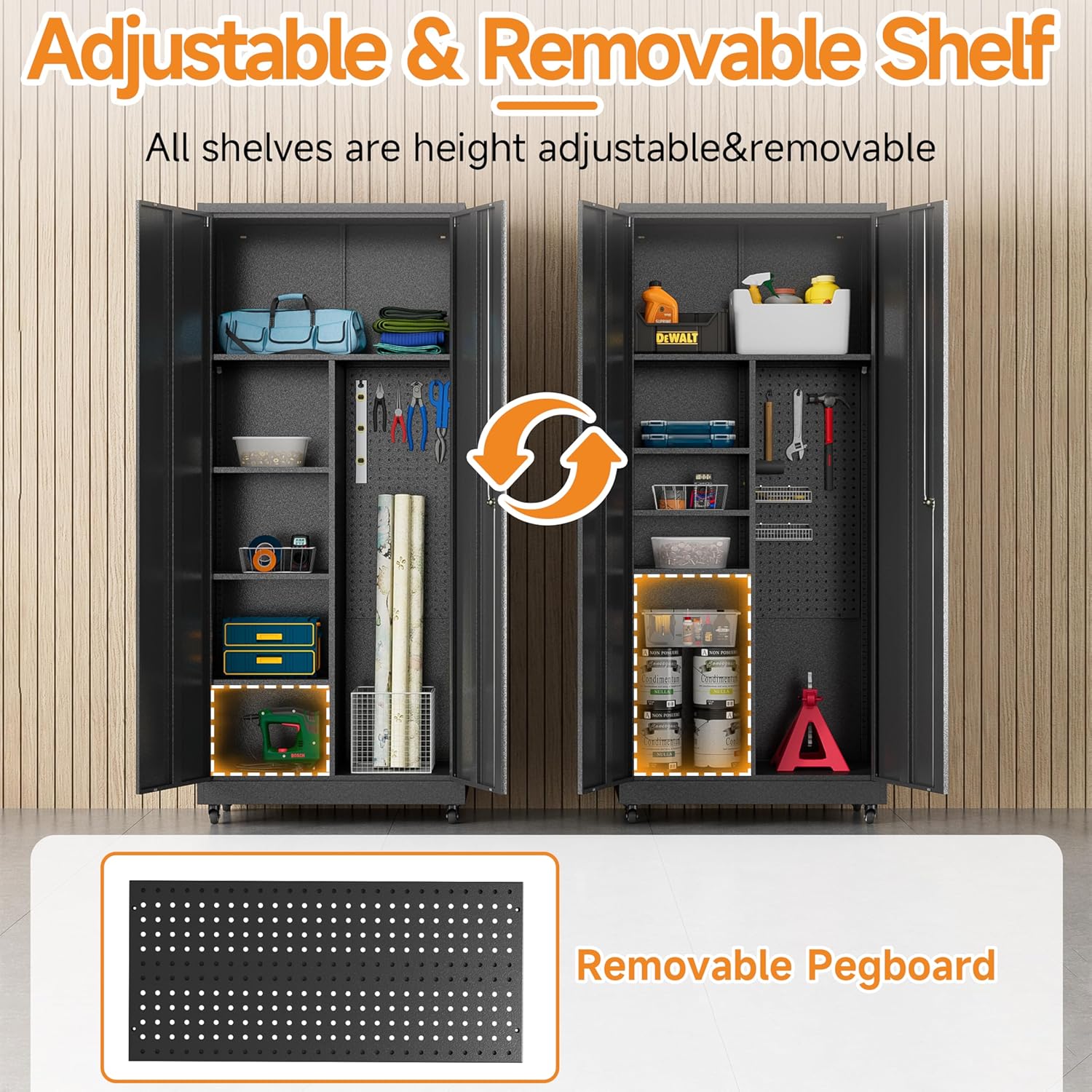 - đ ď¸ăAmple Storage Space with Customizable LayoutăOffering more storage than traditional cabinets, this garage storage cabinet features adjustable and removable shelves to fit tools of any size and a portable pegboard that detaches for on-the-go organization, tailored to your specific needs.