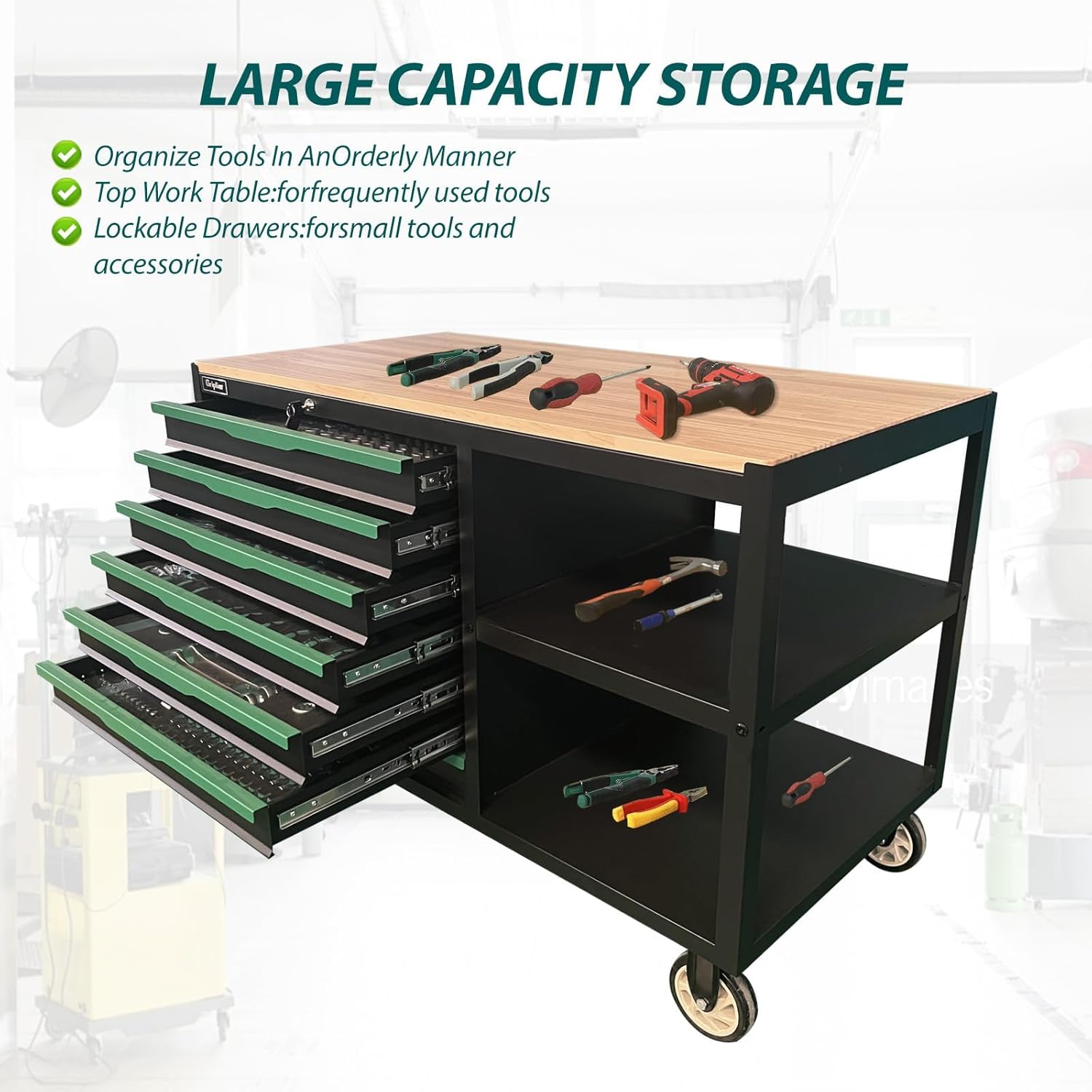 7-Drawers Professional Tool Cart Cabinet,Rolling Tool Chest with Double Shelves,Wood Workbench,Brake Wheels,51.1W x 18.9D x 32.3H inches for Garage, Workshop, or Outdoor Use(7 Drawers)