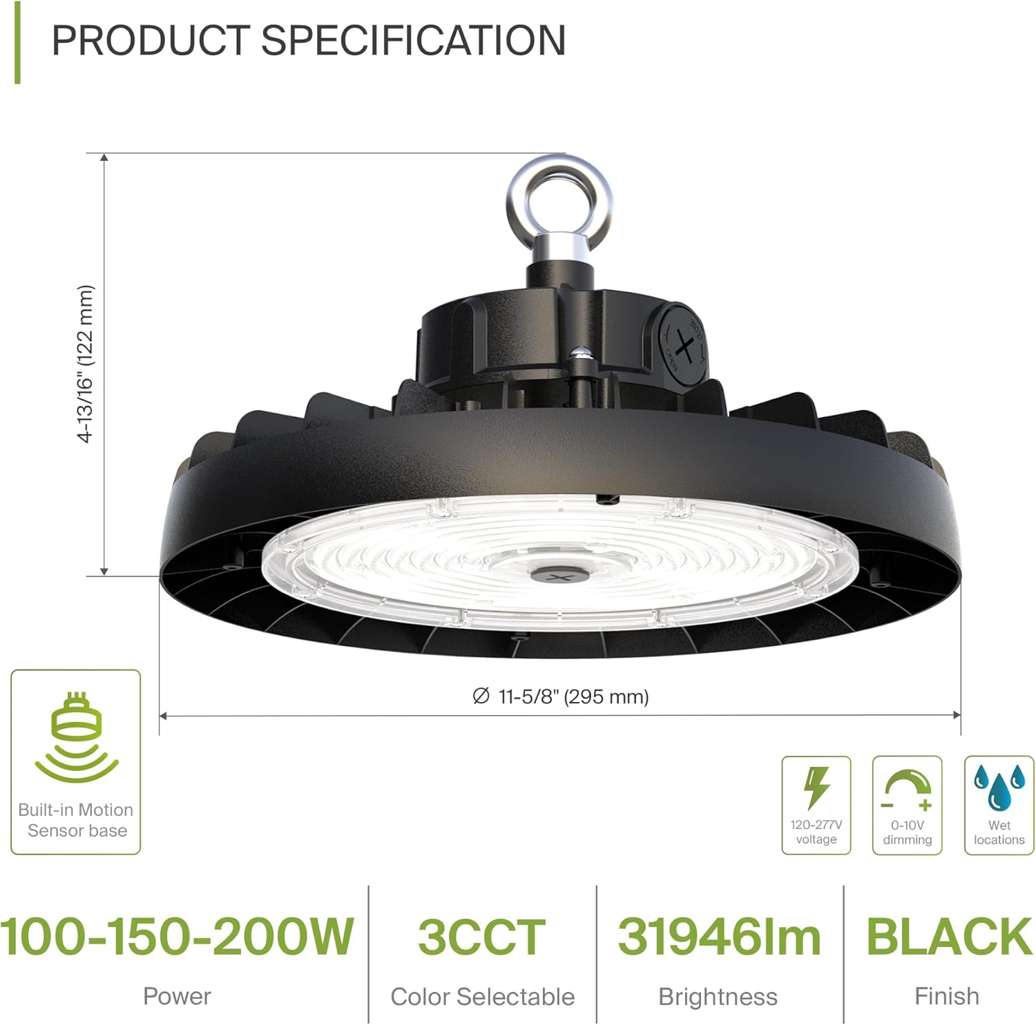 ASD LED High Bay UFO Light Fixture, Commercial Shop Lighting | 3CCT, Dimmable, IP69K Waterproof, DLC Premium, UL Listed | 200W 31900LM 3000-5000K 100-277V | Warehouse, Garage, Workshop Lamp | Black