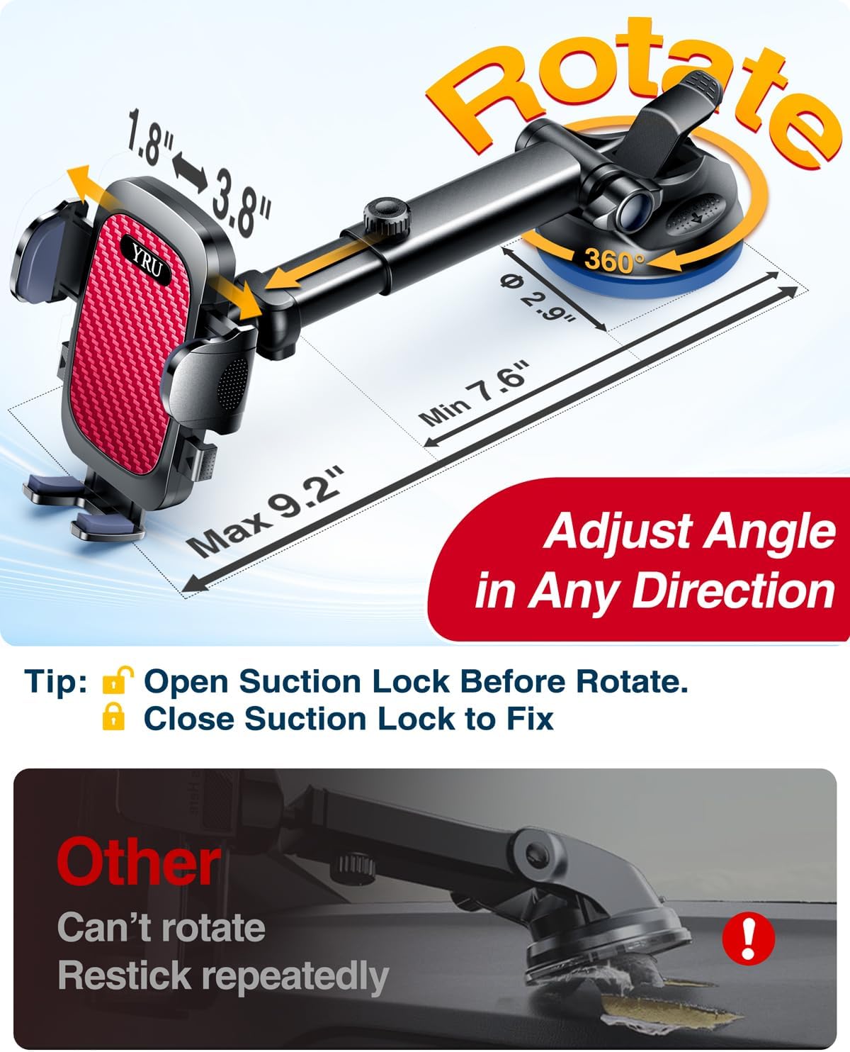 YRU [True Military-Grade & 360 Degrees Rotatable Suction 2025 Ultimate Car Phone Holder Mount ใ90+LBS Safest Strongest & Patent Certsใ Dashboard Windshield Vent for iPhone 16 15 Pro Max Samsung, Red