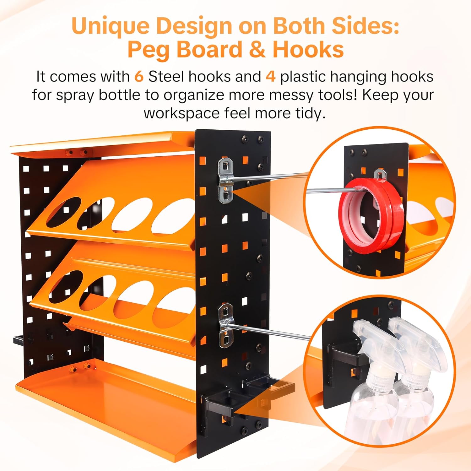 - Unique Design on Both Sides: Peg Board & Hooks It comes with 6 Steel hooks and 4 plastic hanging hooks for spray bottle to organize more messy tools! Keep your workspace feel more tidy