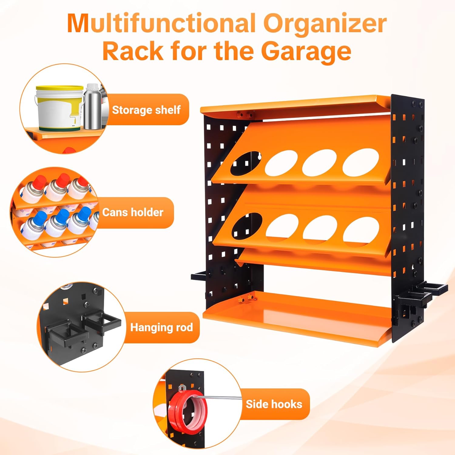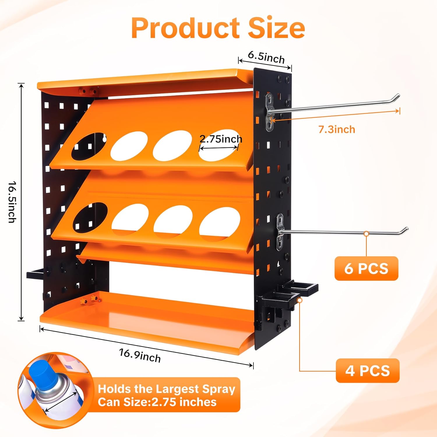Heavy Duty Metal Spray Can Holder - Wall Mount or Countertop Spray Bottle Lube Can Organizer for Garage & Home & Workshop, Peg Board on Both Sides | 8 Can Holes & 6 Steel Hooks, 5 Plastic Hooks
