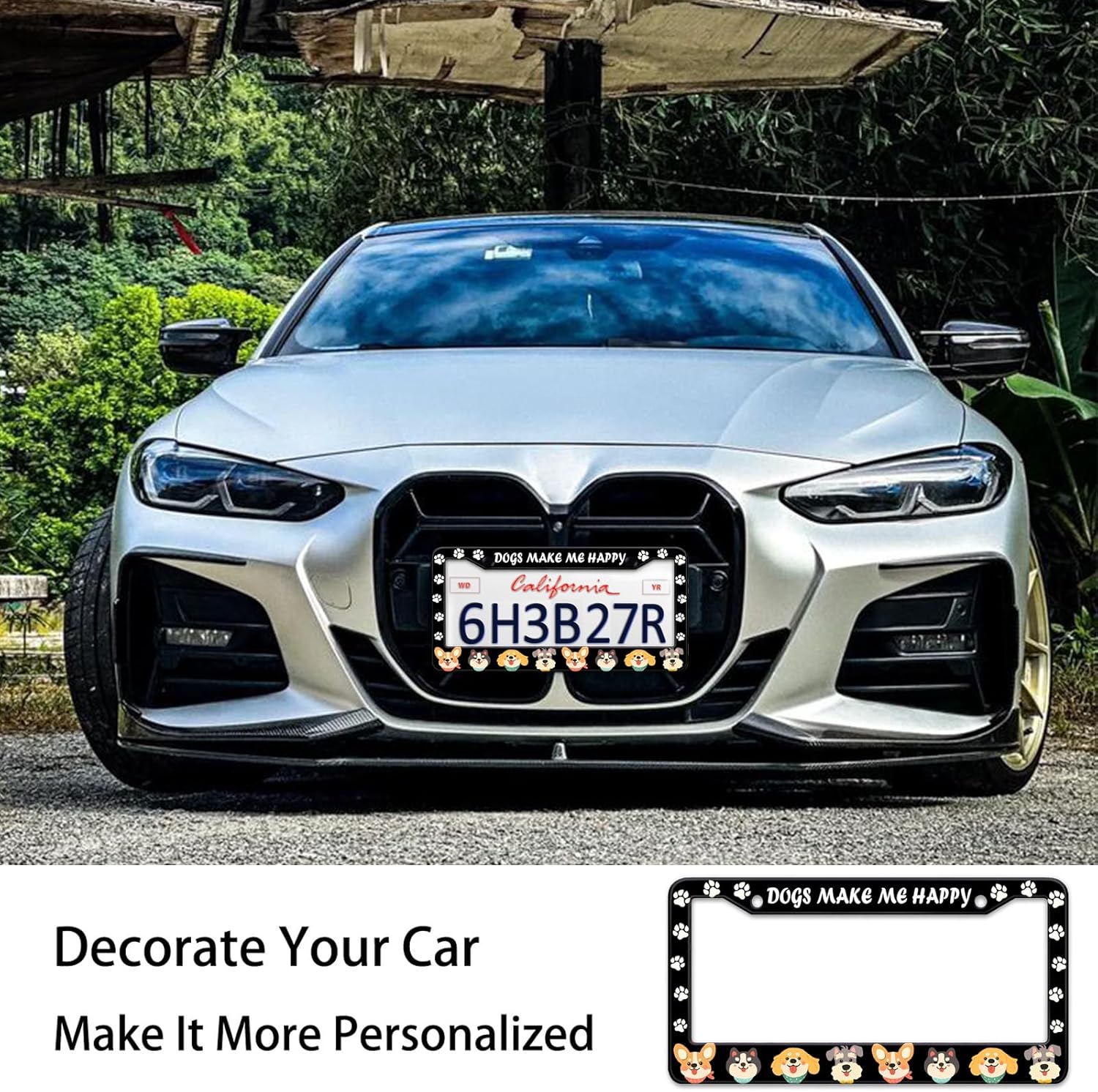Dogs License Plate Frame, Lovely Puppies Dogs Paws Printed License Plate Holder Cover, Dogs Make Me Happy Metal Aluminum Rustproof Car Accessories for Women Men 2 Holes with Screw Caps