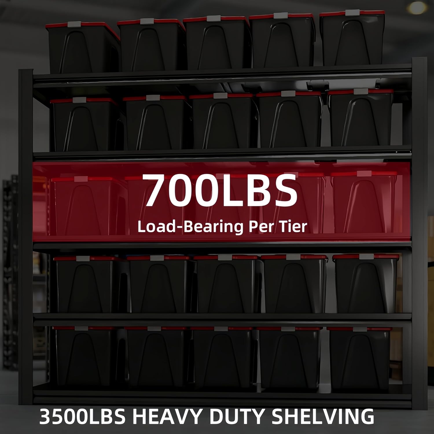 - ă3500LBS Capacity Heavy Duty Garage ShelvesăLI JIU HOME's heavy duty garage shelving unit has thickened double metal legs. Made of high-quality metal, each solid thickened metal shelving with 9 big ribs beneath can hold up to 700 lbs, with a total bearing capacity of 3500 lbs, which makes industrial garage shelves heavy duty more stable and solid than normal metal shelves for storage and more stuff can be stored