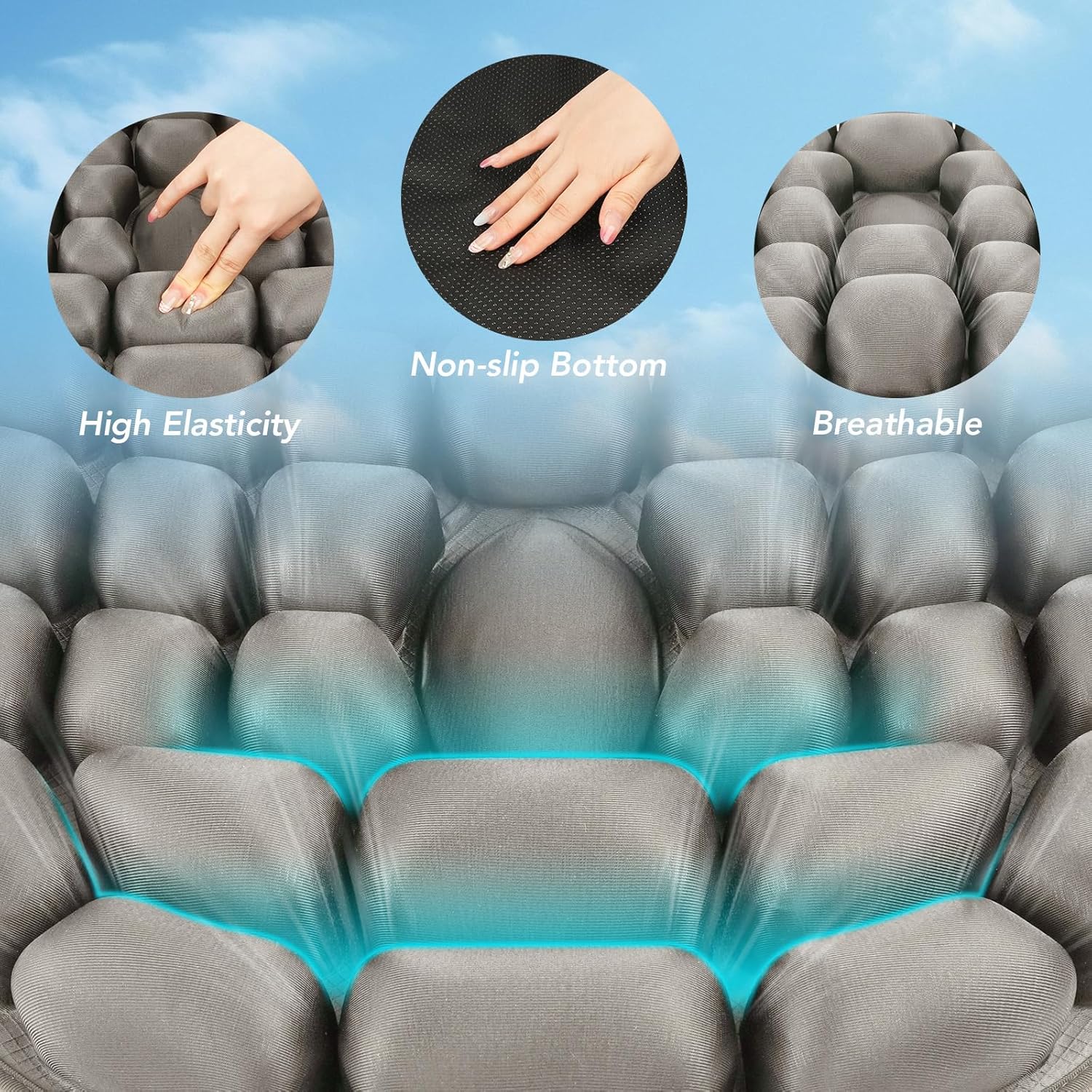 - Bionic Honeycomb Pressure Relief: This 3D inflatable seat cushion equipped with 34 ergonomic airbags dynamically conform to your body, targeting the ischial bones and coccyx to disperse pressure by up to 73%. Patented spinal alignment technology transforms hard seats (even economy-class) into sofa-like comfort—ideal for office workers, travelers, and lumbar recovery