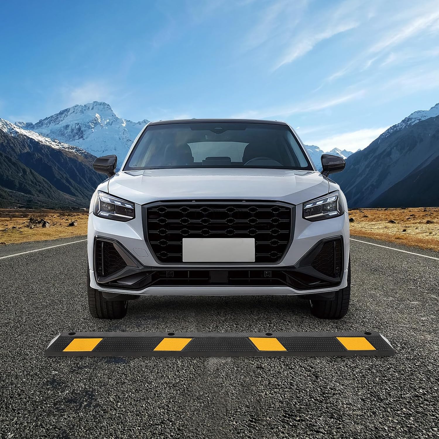 Parking Stoppers for Garage, 72 Inch Premium Parking Block Curb with Yellow Reflective Stripe, Heavy Duty Wheel Stopper for Cars, Vehicles, Trucks, Installation Kits Included, Pack of 2