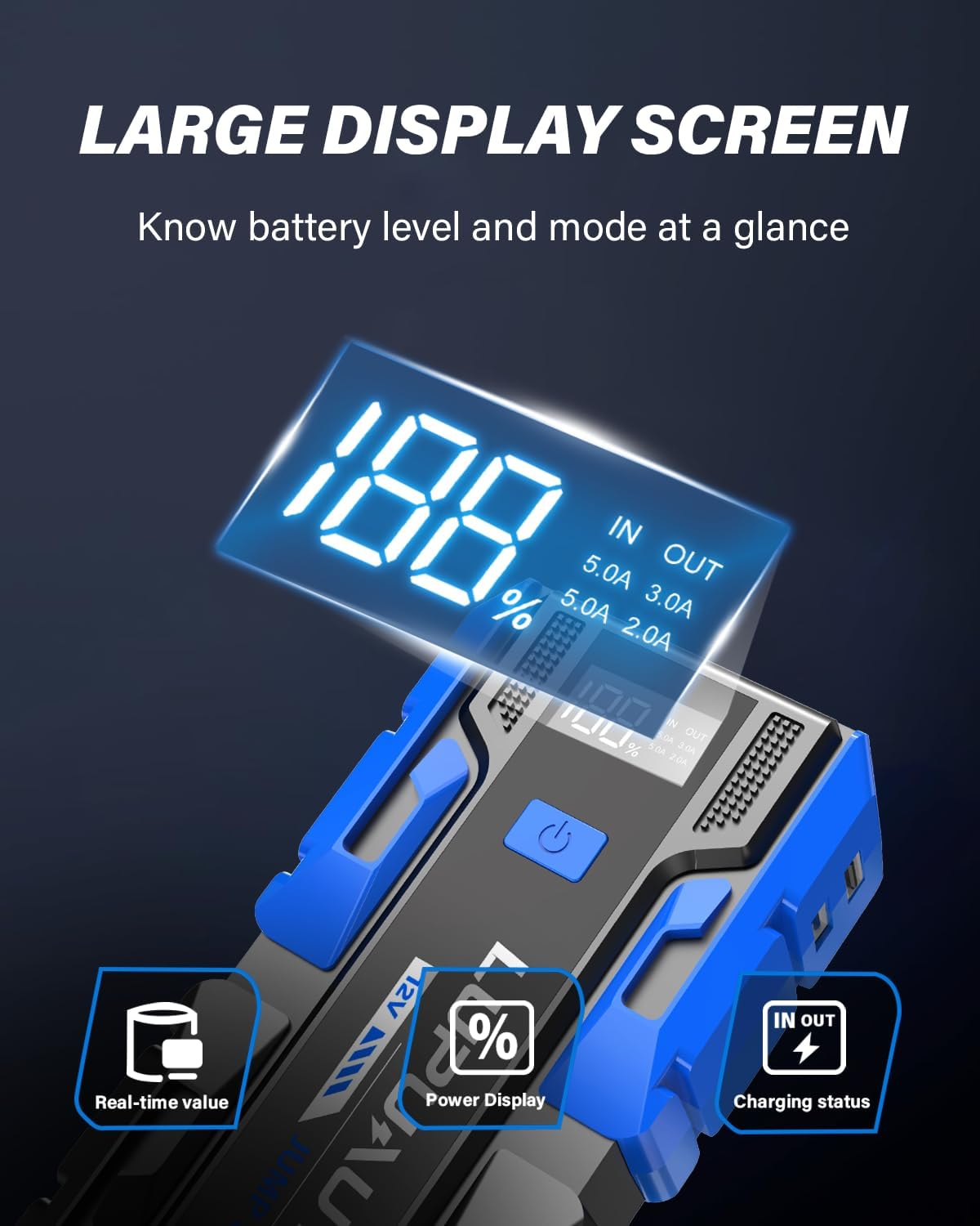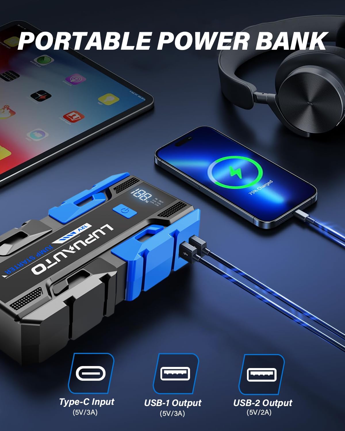 - Fast charging:3000A car jump starter battery pack doubles as a portable power bank. Dual USB-A ports (up to 5V) charge your multiple devices at the same time, such as cell phones, tablets, car air compressors and so on. USB-C 5V input port for faster self-charging. Whether it's car emergency or daily charging, the car battery charger jump starter is ready to provide strong power anytime and anywhere, making it a perfect choice for travel or camping.