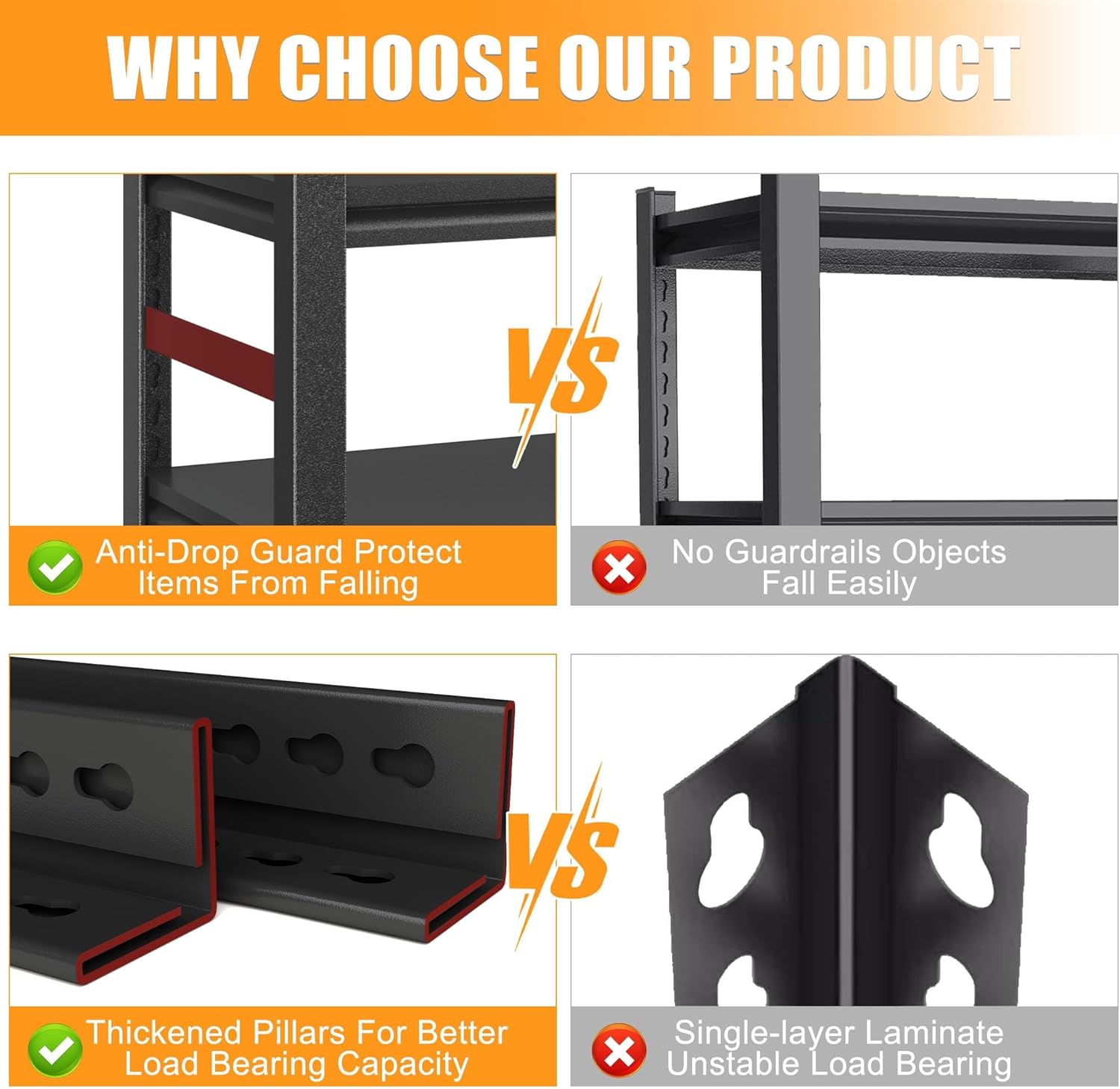 - ăSuperb Weight CapacityăEngineered with industrial-grade cold-rolled steel for superior strength and weldability, this heavy-duty shelving unit outperforms wooden racks prone to warping or moisture damage. Reinforced crossbars and stabilizing braces ensure unwavering stability, even under heavy loadsâno wobbling or bending over time