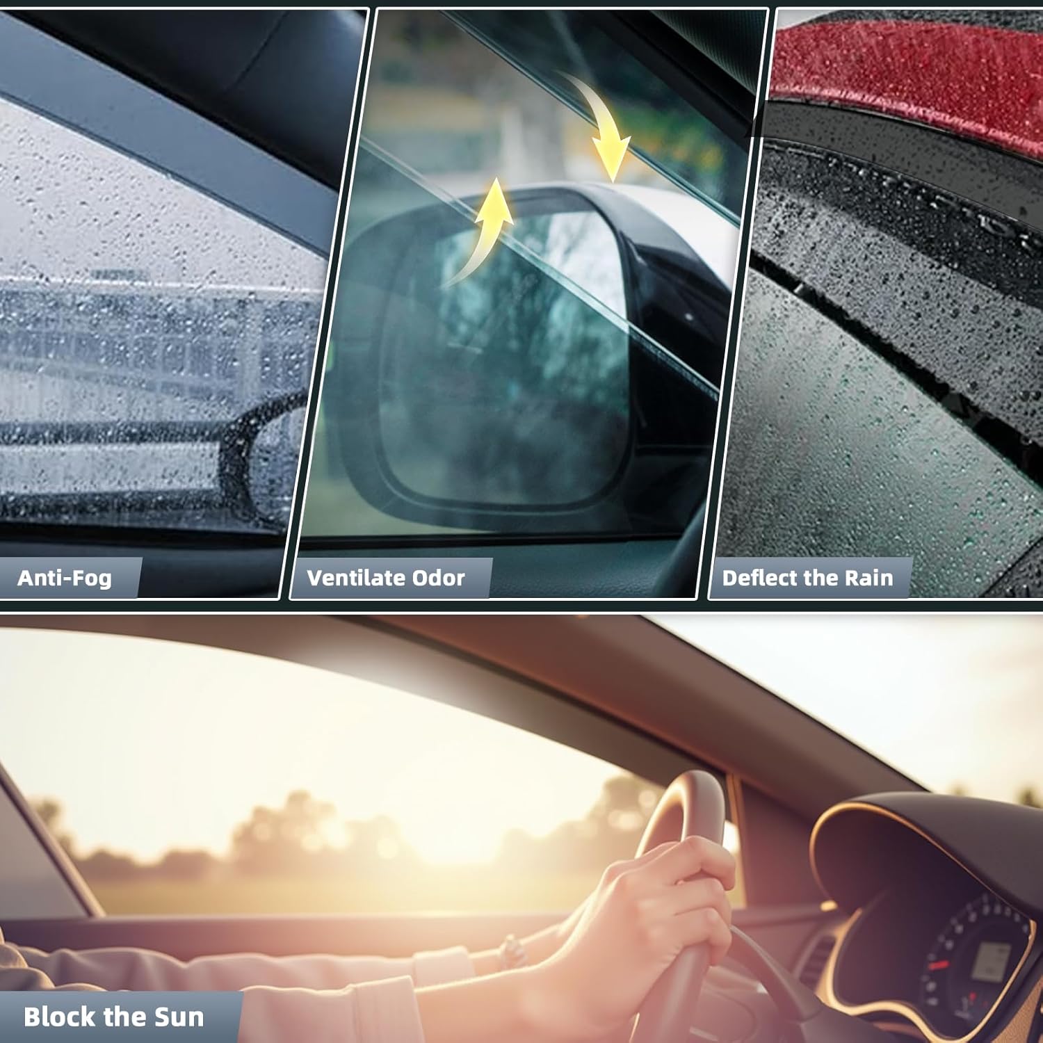 - ăImproved Ventilation and Air FlowăAllows fresh air to circulate through open windows while keeping the rain out or reduces heat. Reduce mirror and window fogging; reduce sun glare through side window. Dark Smoke translucent color will not obstruct the driver's view while driving