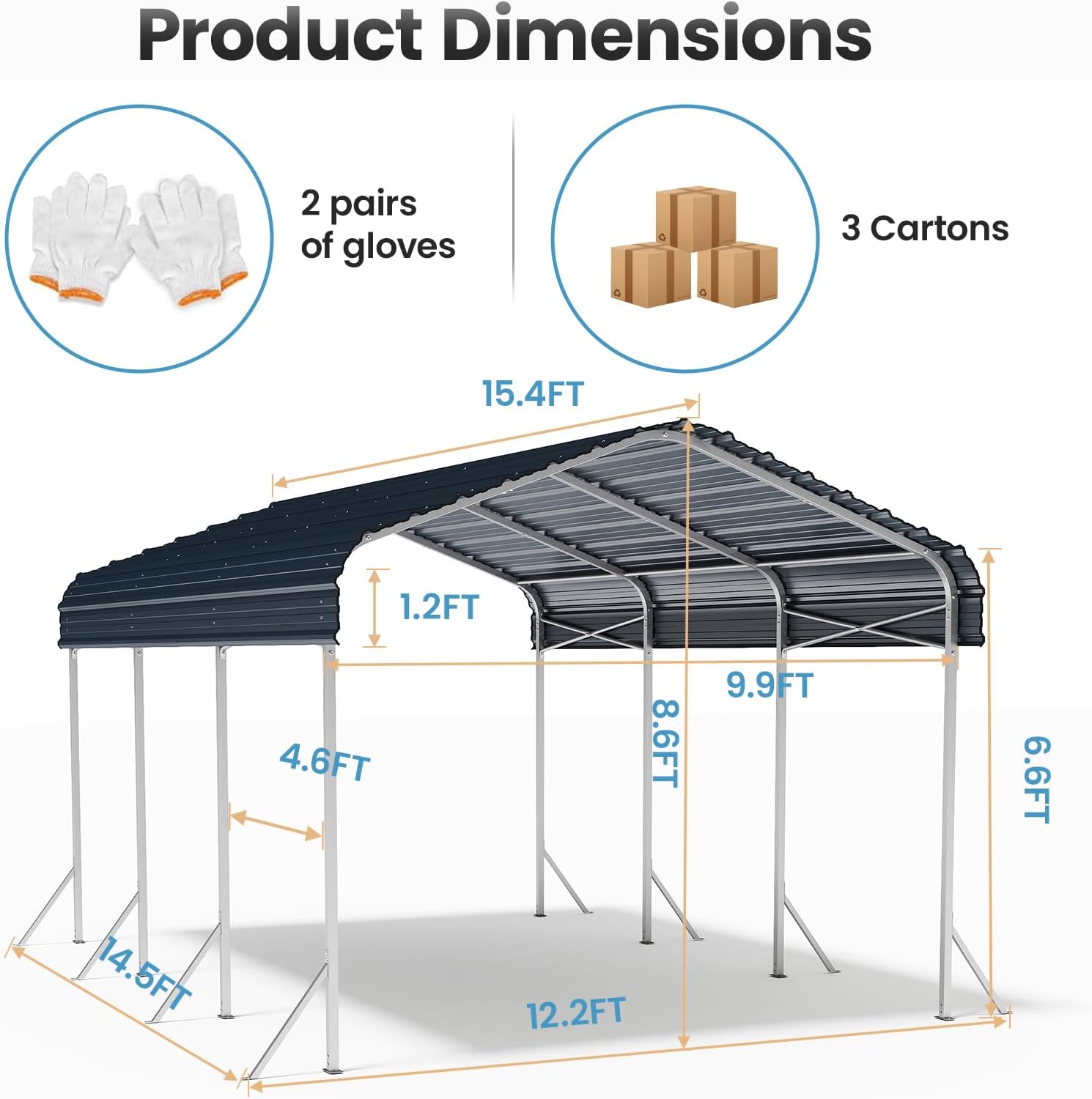 10x15' Heavy Duty Metal Carport – Sturdy Structure, All-Weather Protection, Easy Assembly for Cars, Trucks, Boats, Tractors, and Outdoor Storage (Grey, 10x15FT)